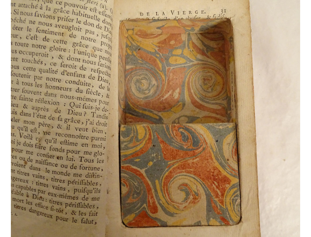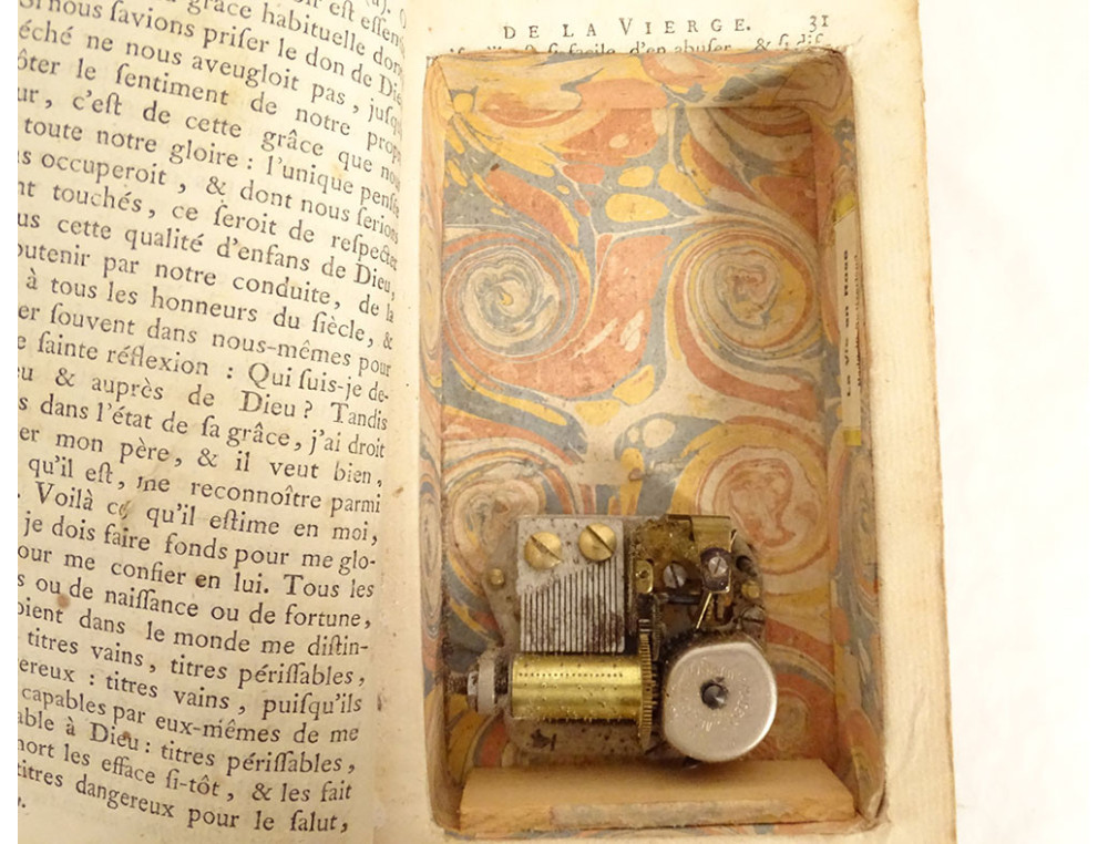 This book is in good overall condition, in its original state. The book dates from the 18th century, the secret compartment and the music box probably date from the early 20th century.
