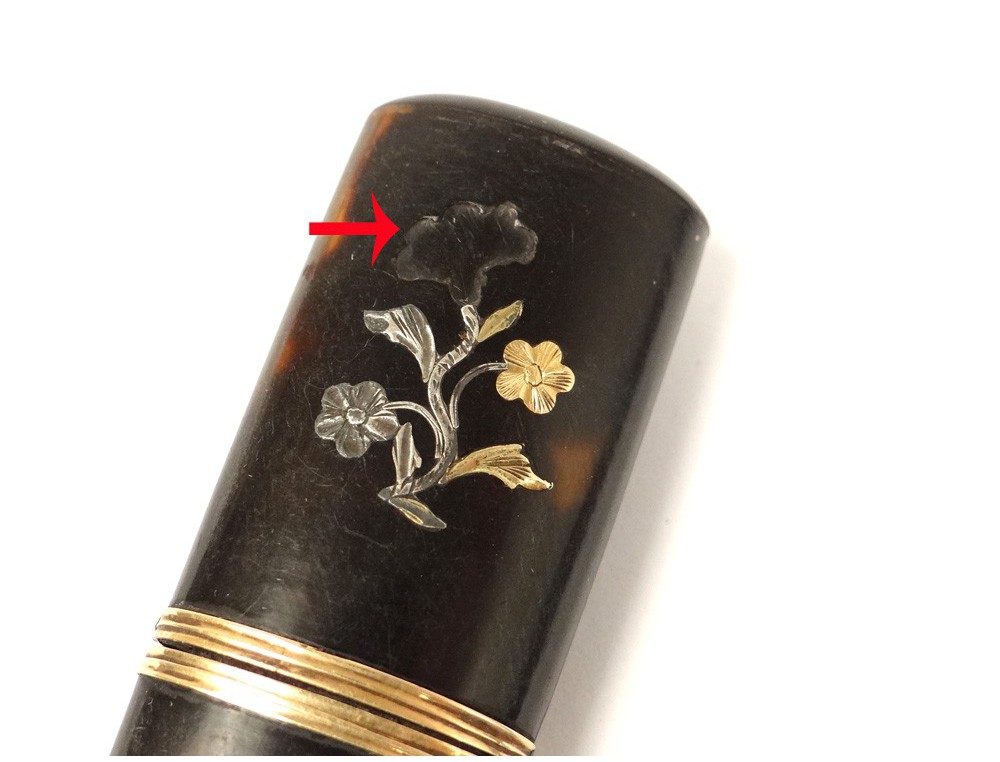 Lovely needle case, decorated with silver inlays and silver gilt small flowers, XIXth century.