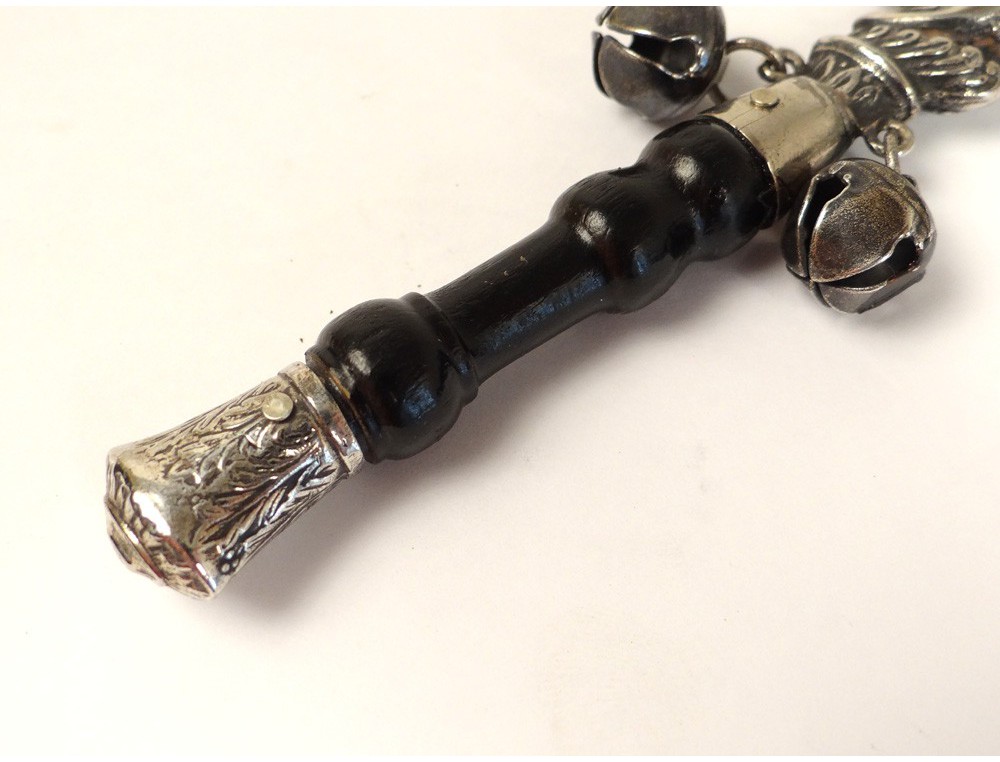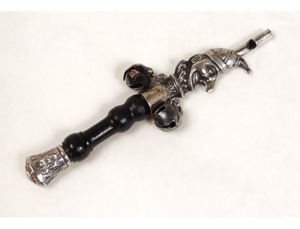 Rattle whistle silver metal blackened wood character Pierrot moon twentieth century