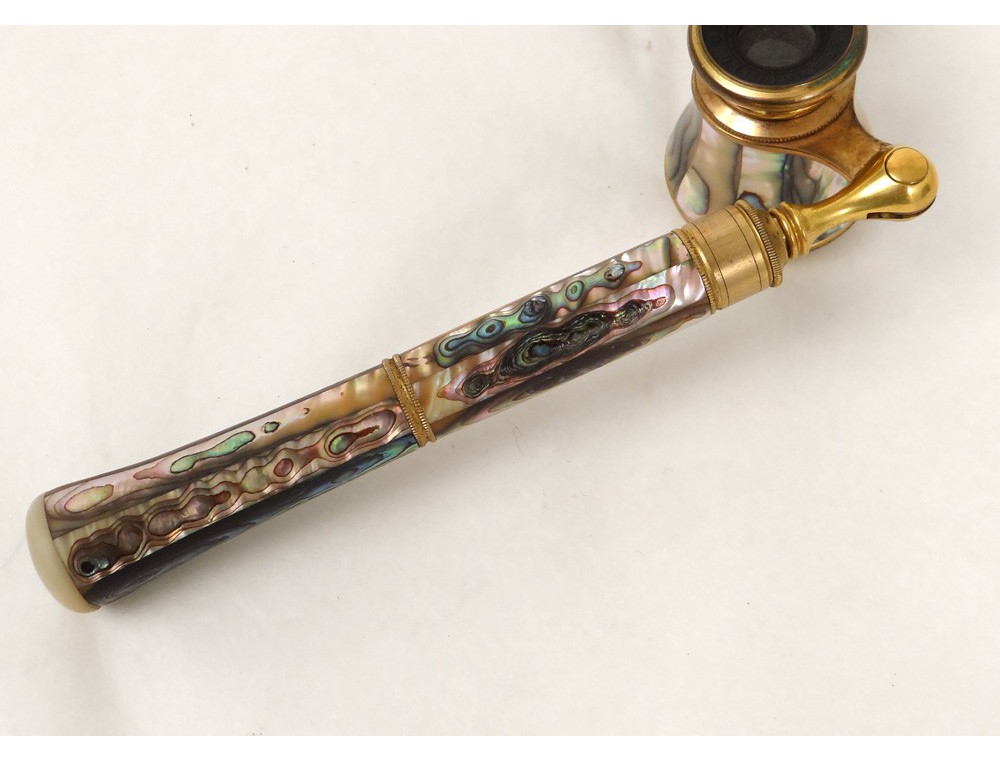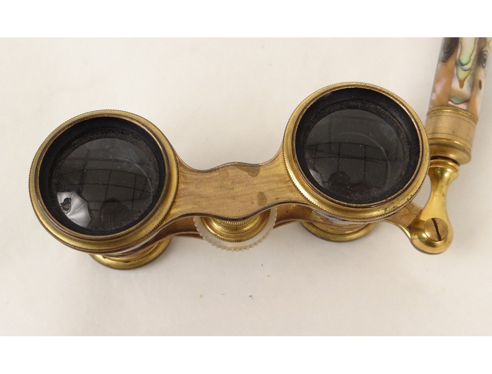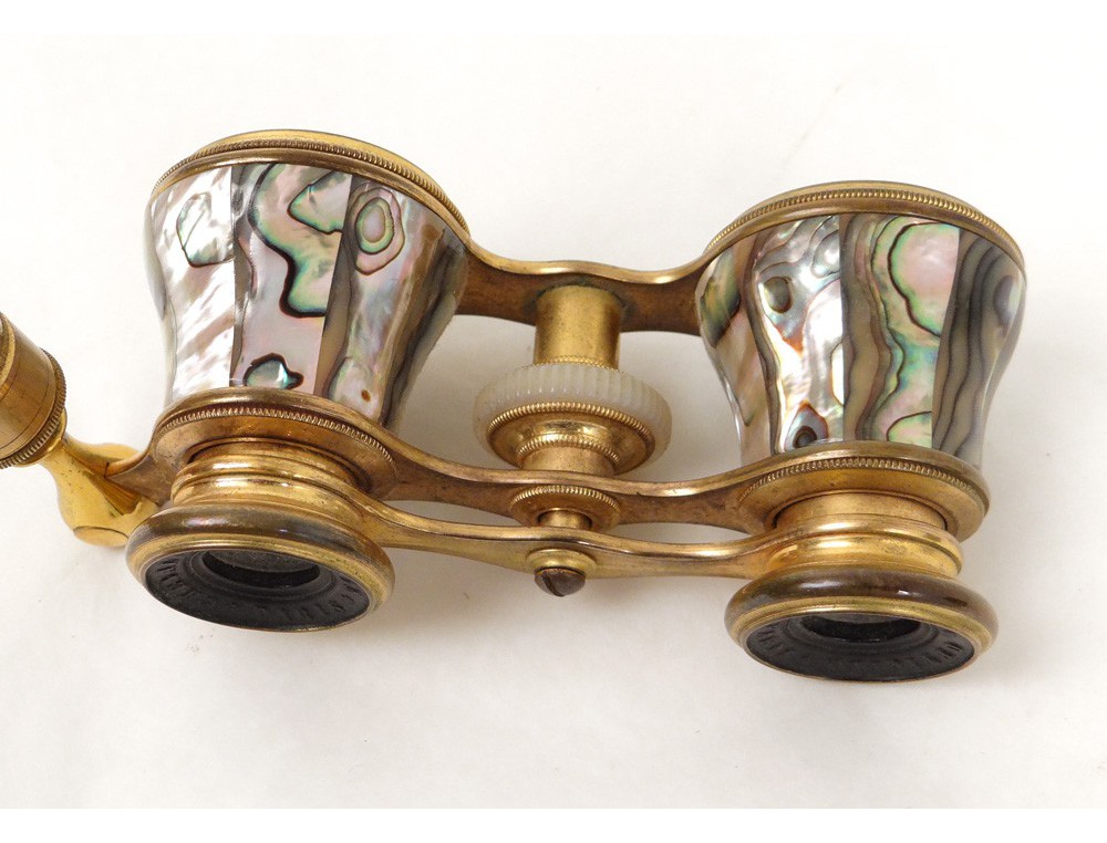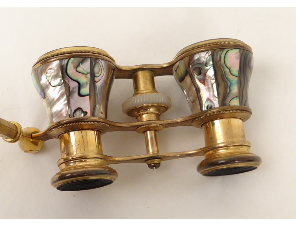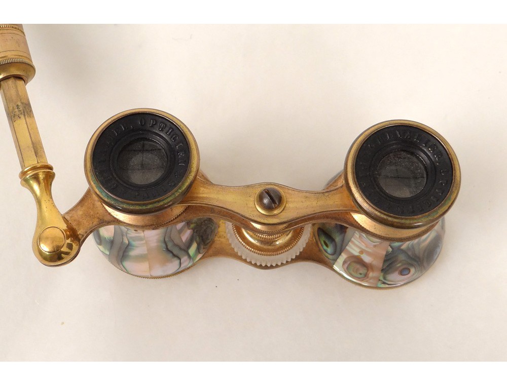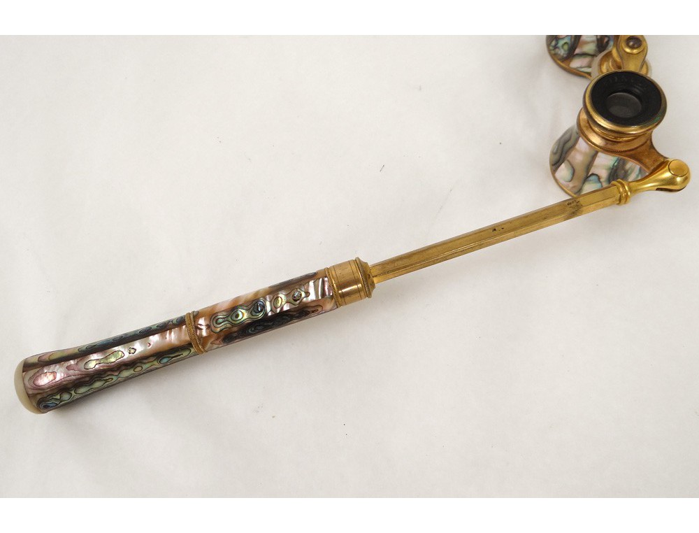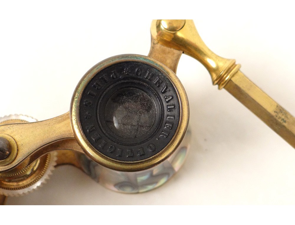 Very nice pair of retractable handle opera glasses, gilded brass and mother of pearl, signed by the optician Chevalier * Paris, Napoleon III nineteenth century.