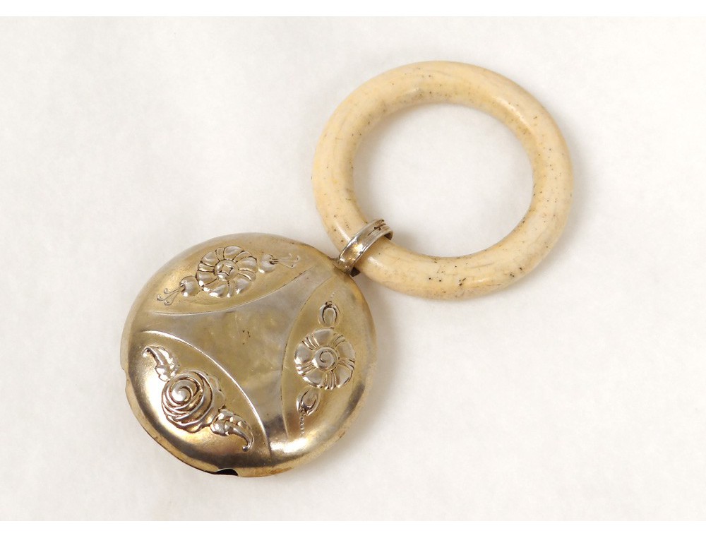 Very nice little rattle in silver gilt decorated with finely carved small flowers, boar's head punched, ring bone (beef), Vintage Art Nouveau late nineteenth and early twentieth centuries.