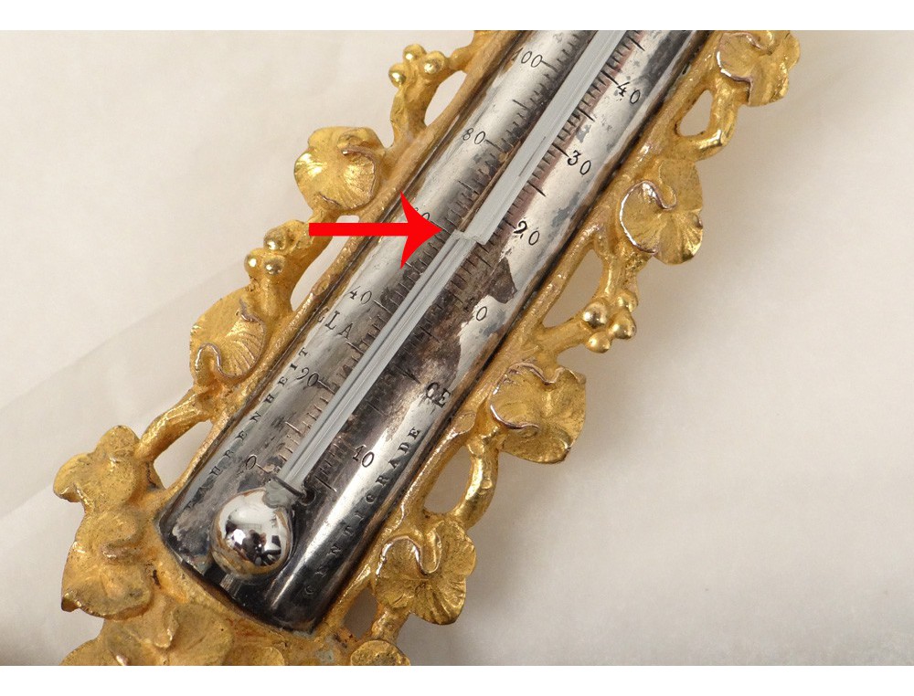 Very nice thermometer finely carved gilt bronze depicting a young child holding a branchegarnie vine leaves and grapes which appears the thermometer marble base, Napoleon III nineteenth century.