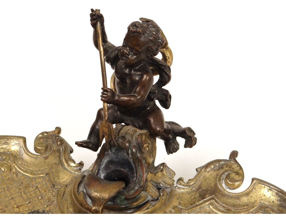 Very nice inkwell Louis XV bronze two patinas (gold and brown) representing a cherub holding a trident, sitting on a dolphin-shaped base carved shell adorned with stylized foliage, Napoleon III nineteenth century.