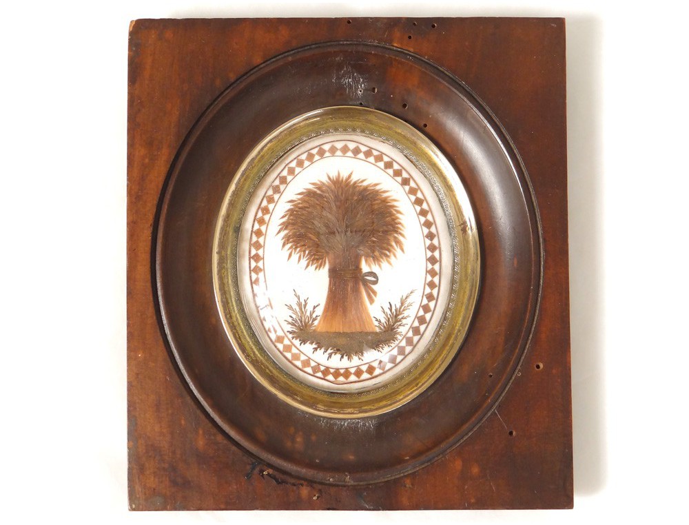 Thumbnail hair work representing a big stacked wheat surrounded by a frieze with geometric pattern in a wooden frame, Napoleon III nineteenth century.
