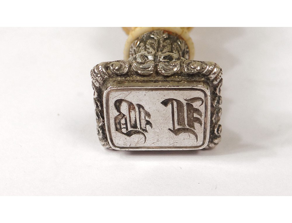 * Seal or stamp in silver (or silver) finely carved with stylized foliage decor, representing a monogram, bone handle (beef) carved work Dieppe, XIXth century.