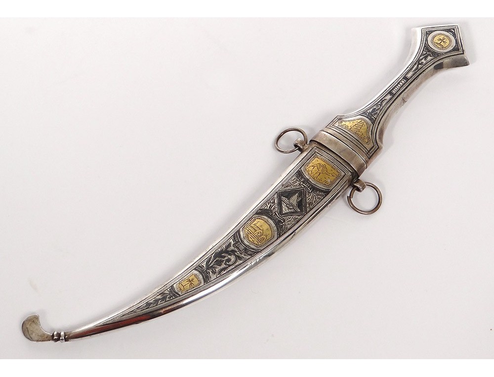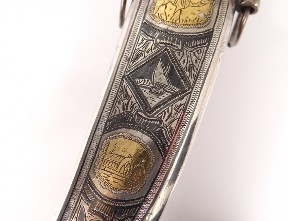 Silver metal letter opener and finely inlaid gold, palm decor, a camel, landscapes and boat as well as plant motif, shaped like Eastern Koumia dagger from Caucasus, nineteenth-early end time twentieth centuries.