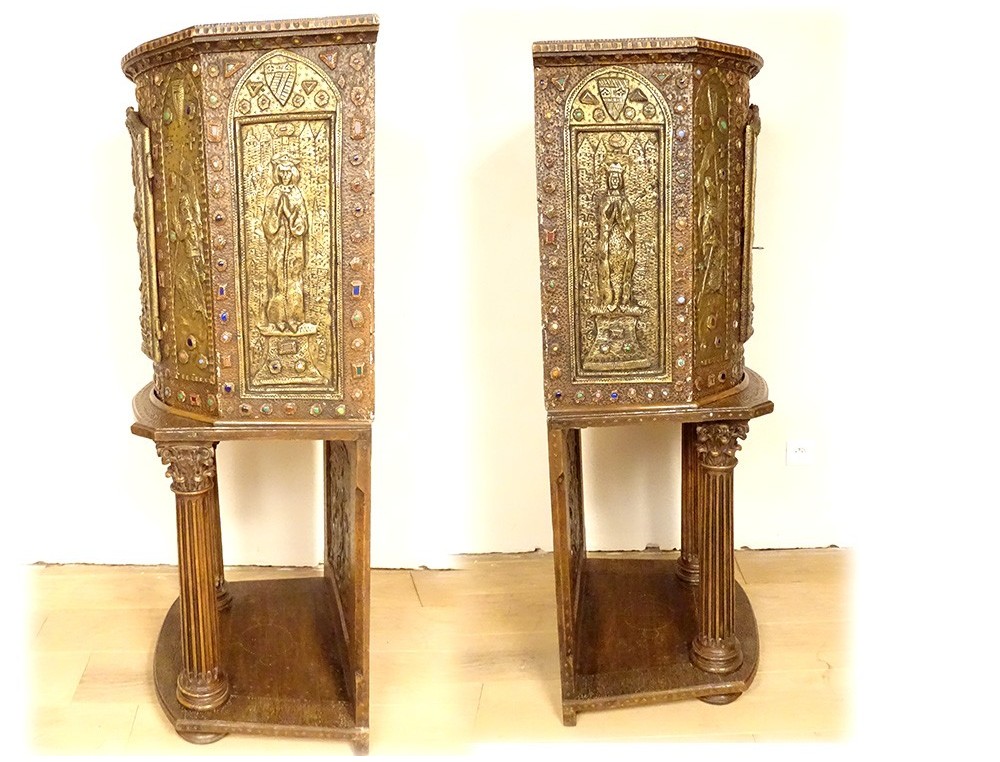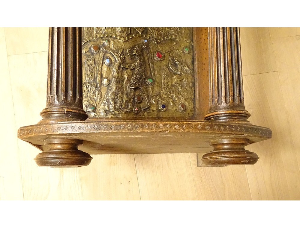 Rare embossed copper tabernacle decorated with colored glass cabochons, with two fluted columns on the front, representing Saint Germain* (SCS Germanus) as well as battle scenes (or crusades), kneeling soldiers, as well as two figures (most probably kings) on the sides, Orthodox or Byzantine inspiration, from the 19th century.