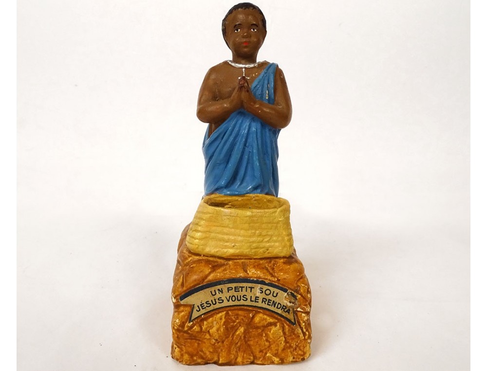 Painted plaster offering box, called Jesus or the Seeking Angel, representing a kneeling and praying black child, the head is animated (moves as soon as a coin is put in), inscription "A little penny Jesus will pay you back", from the late 19th-early 20th centuries.