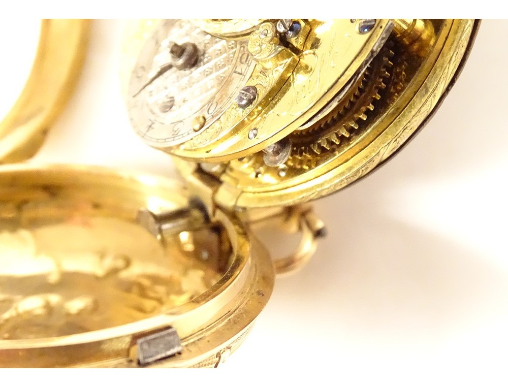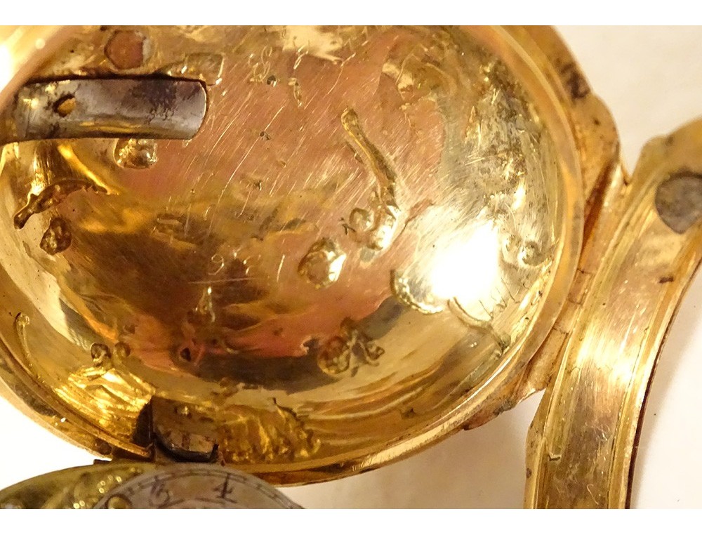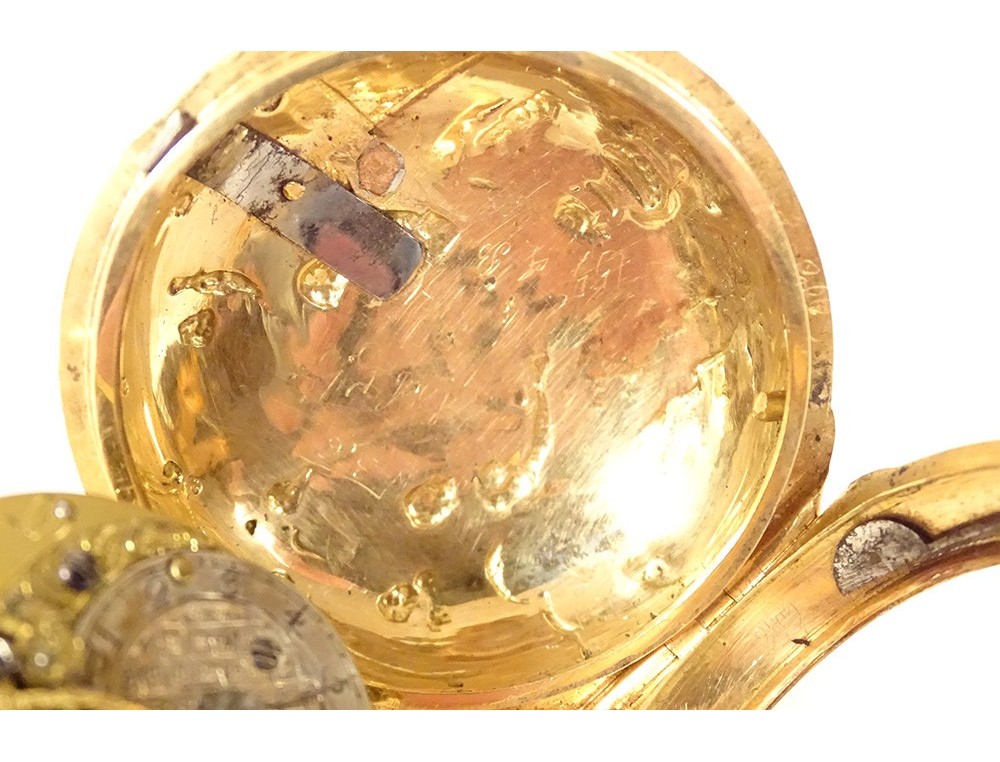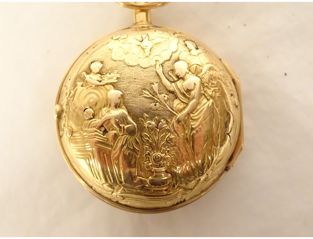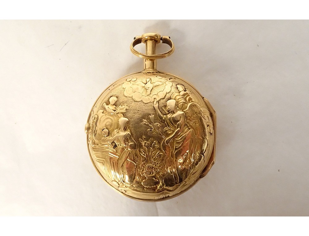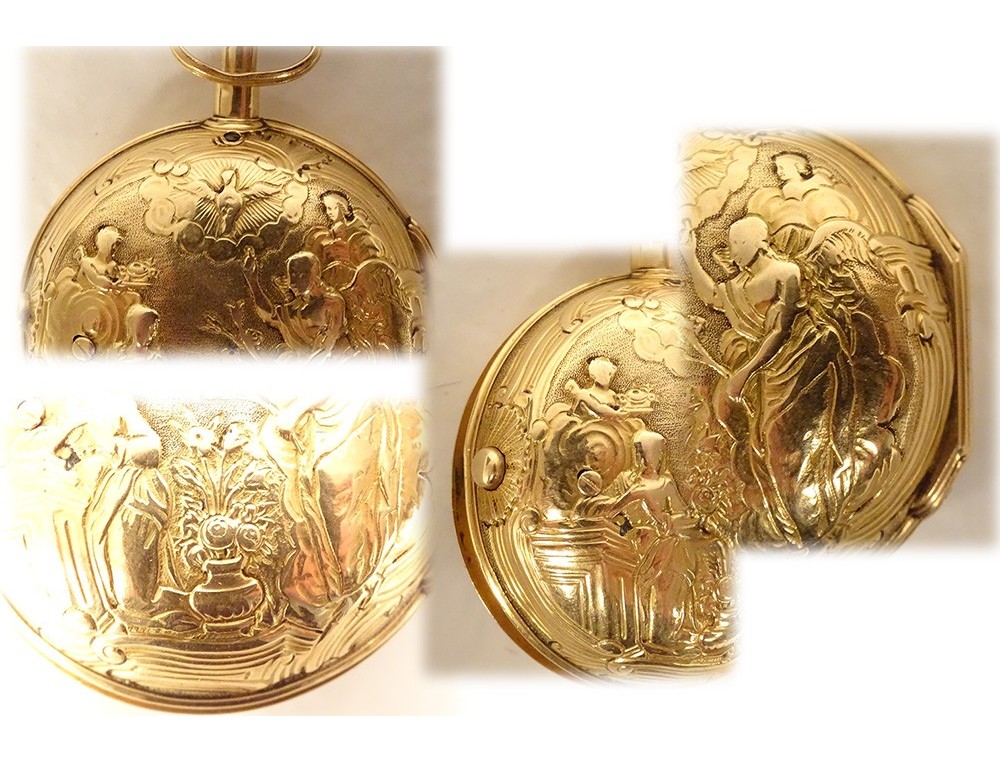 Rare 18 carat solid gold cockerel watch hallmarked Fermiers Généraux, toc* strike, reverse chimed with the scene of the Annunciation with the Virgin Mary and the Archangel Gabriel, the dove of the Holy Spirit above them, signed Les Frères Rosset? in Switzerland, 18th century.