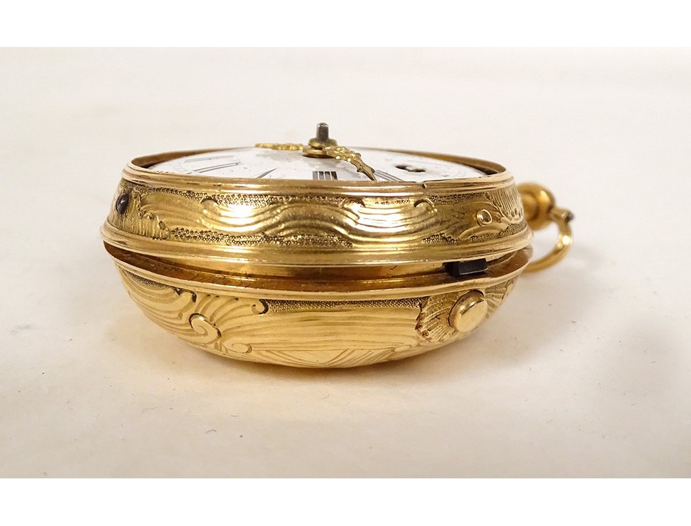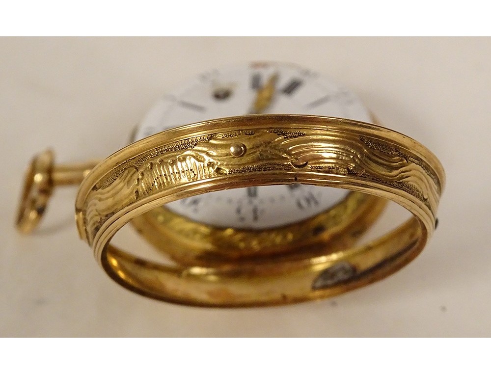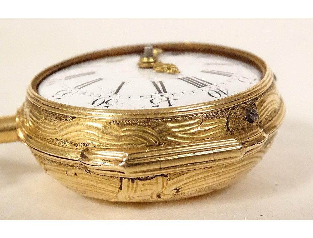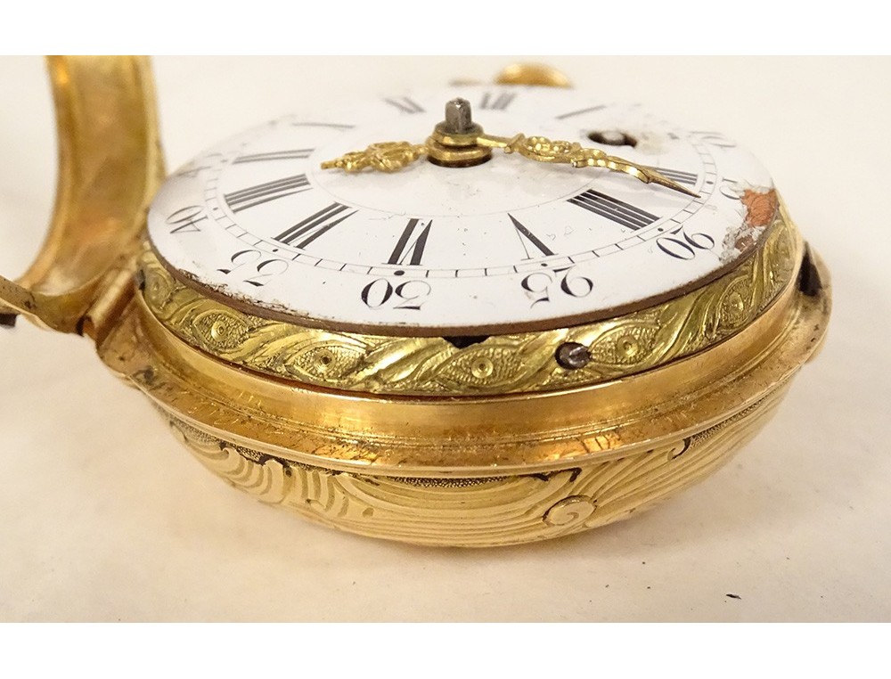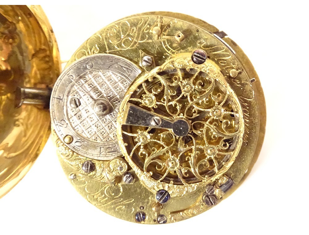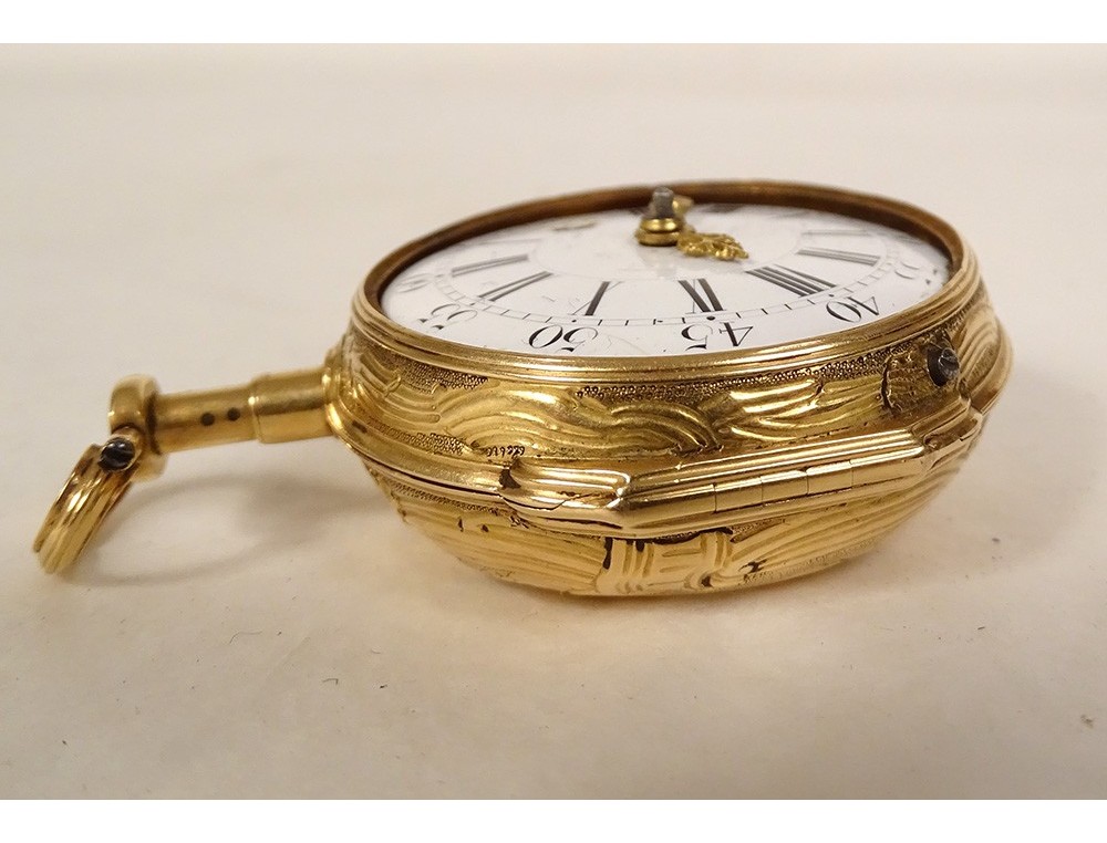 Rare 18 carat solid gold cockerel watch hallmarked Fermiers Généraux, toc* strike, reverse chimed with the scene of the Annunciation with the Virgin Mary and the Archangel Gabriel, the dove of the Holy Spirit above them, signed Les Frères Rosset? in Switzerland, 18th century.