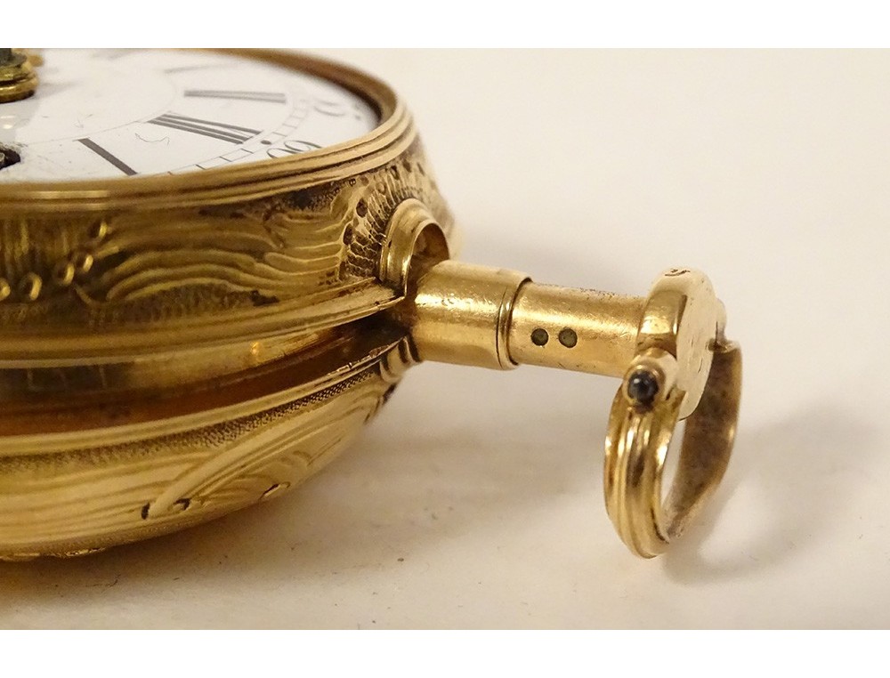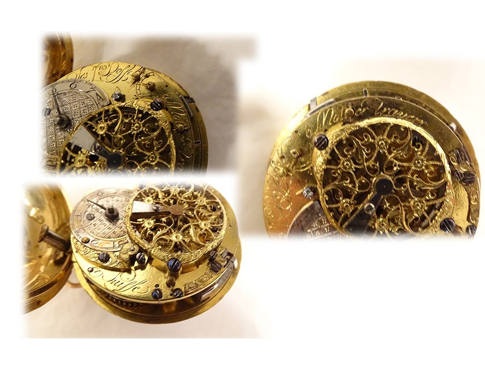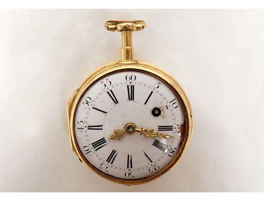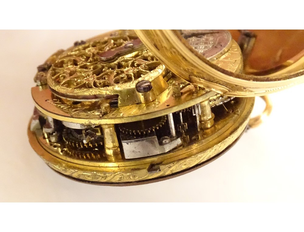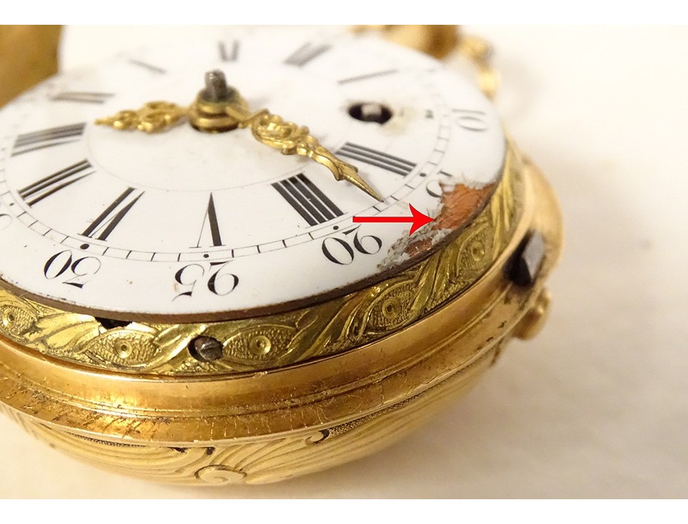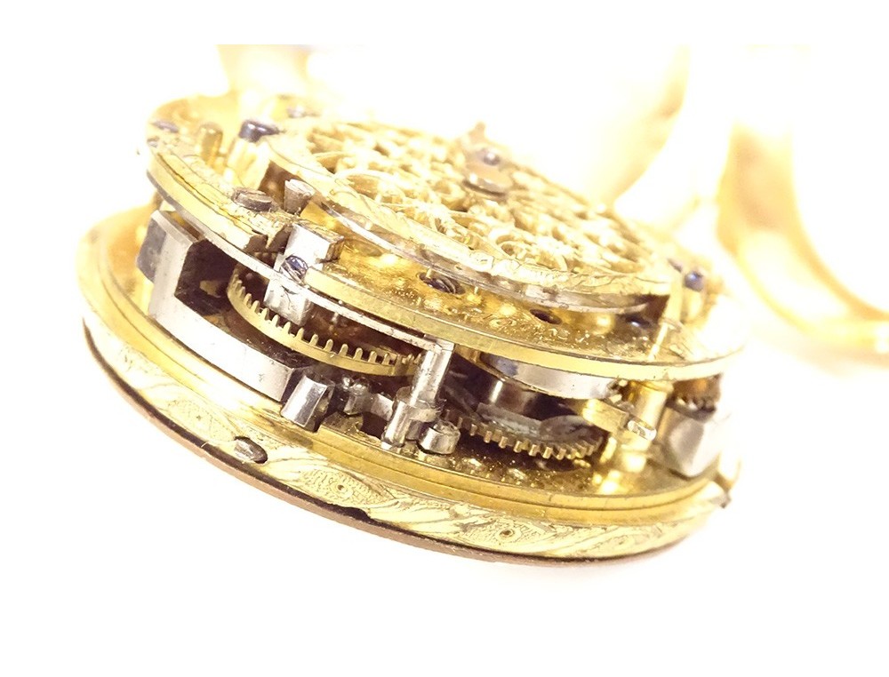 Rare 18 carat solid gold cockerel watch hallmarked Fermiers Généraux, toc* strike, reverse chimed with the scene of the Annunciation with the Virgin Mary and the Archangel Gabriel, the dove of the Holy Spirit above them, signed Les Frères Rosset? in Switzerland, 18th century.