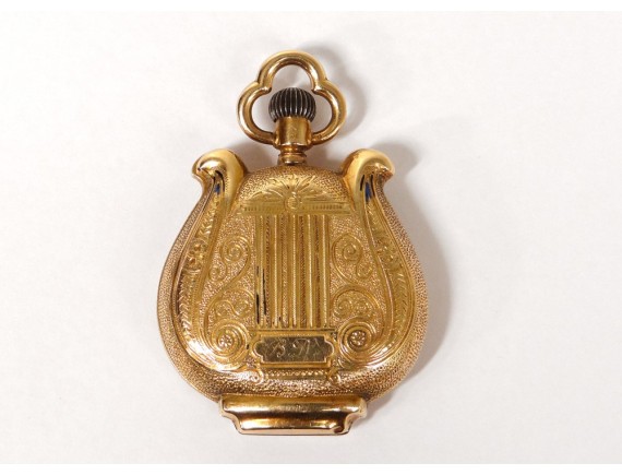 Lyre-shaped pocket watch, in finely chiseled 14-carat gold decorated with floral friezes, hallmarked Ecureuil (2nd grade gold, Switzerland 1880-1933), signed by the watchmaker Perret & Fils* Geneva, from the late 19th-early 20th centuries.