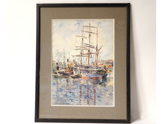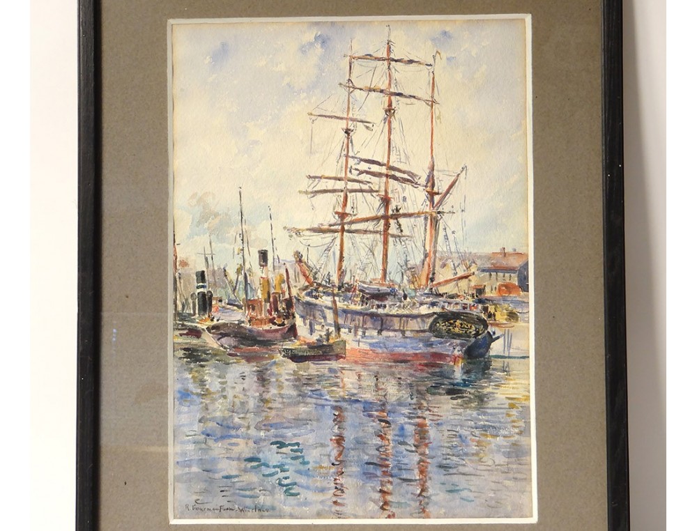 Watercolor signed R. Fourmaintraux-Winslow * representing a view of the port of Boulogne-sur-Mer in the north of France, including a three-masted sailboat in the foreground, vintage early twentieth century.