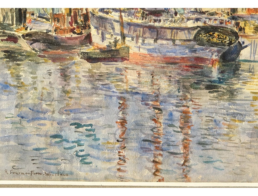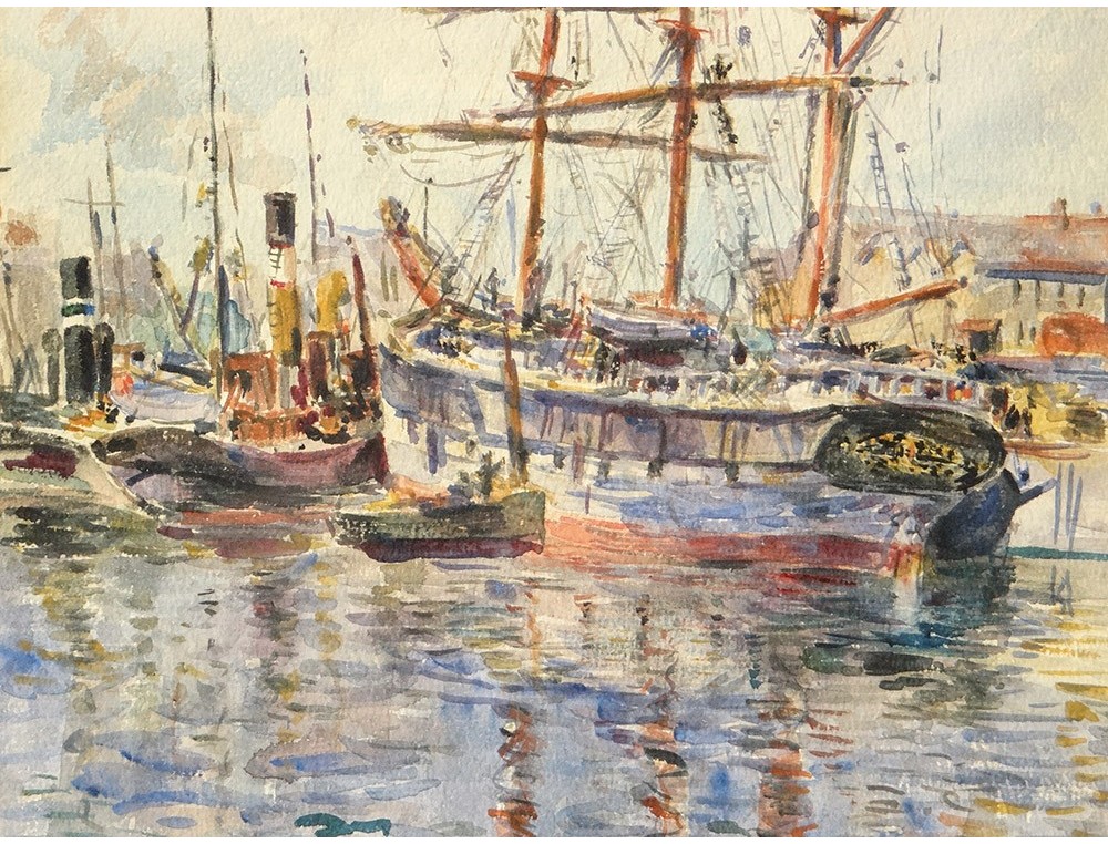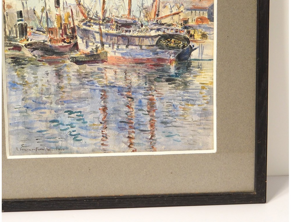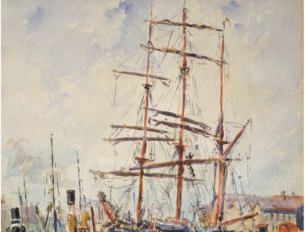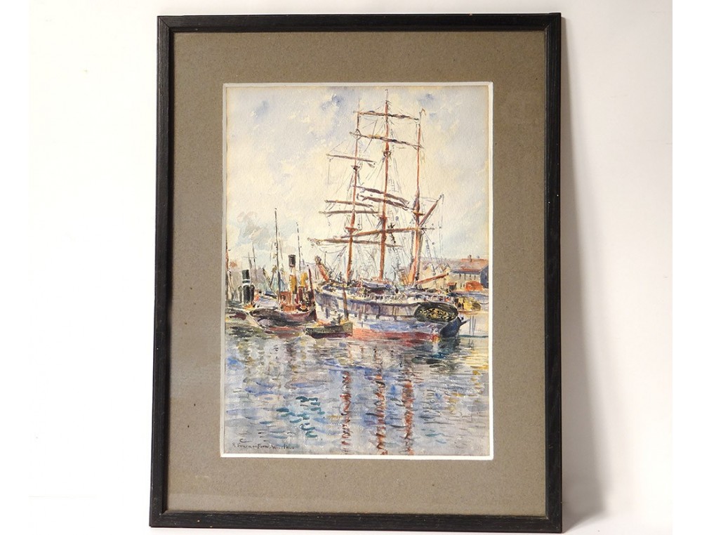 Watercolor Fourmaintraux-Winslow port Boulogne-sur-Mer three-masted boat twentieth