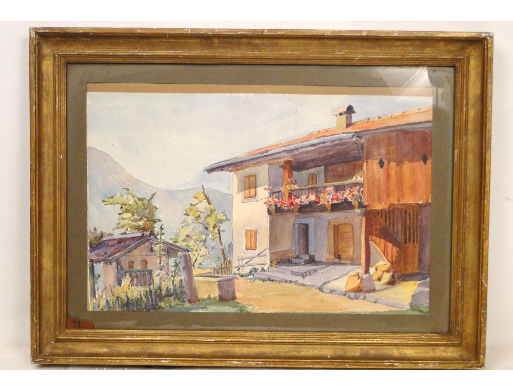Watercolour in its gilded frame by Marie Antoinette Bidart representing a house in Savoy, in the early twentieth century era.