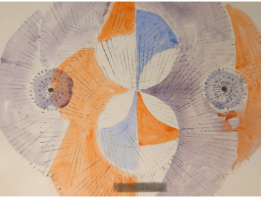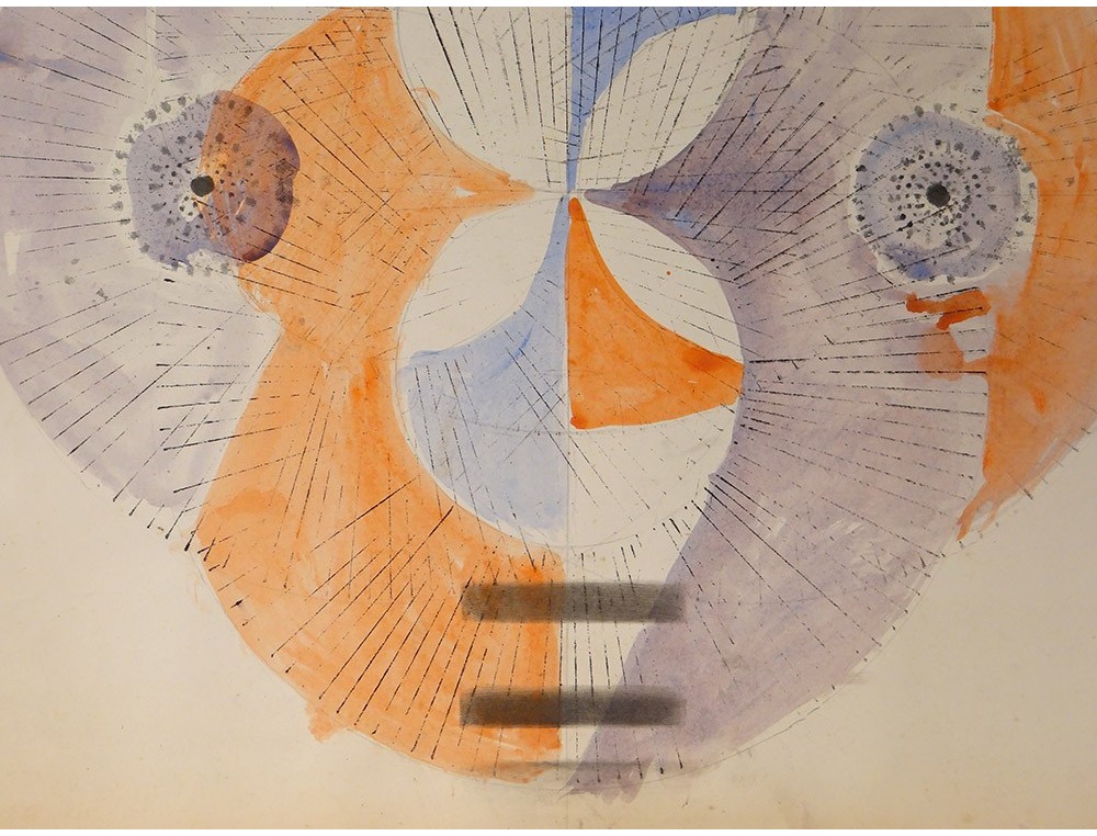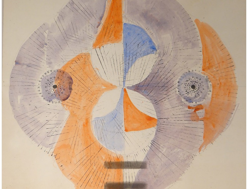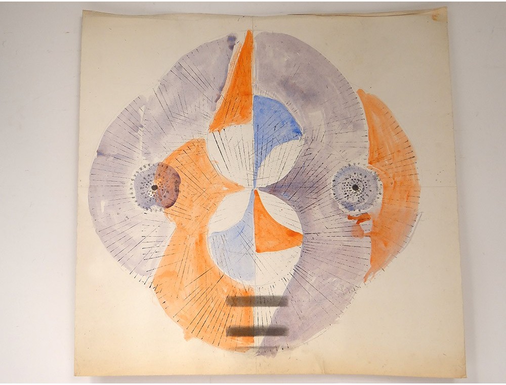 Watercolor drawing by Ernst Van Leyden *, representing a composition with an abstract face, project and stage of work for his famous lithograph "Rotation I" (1967)