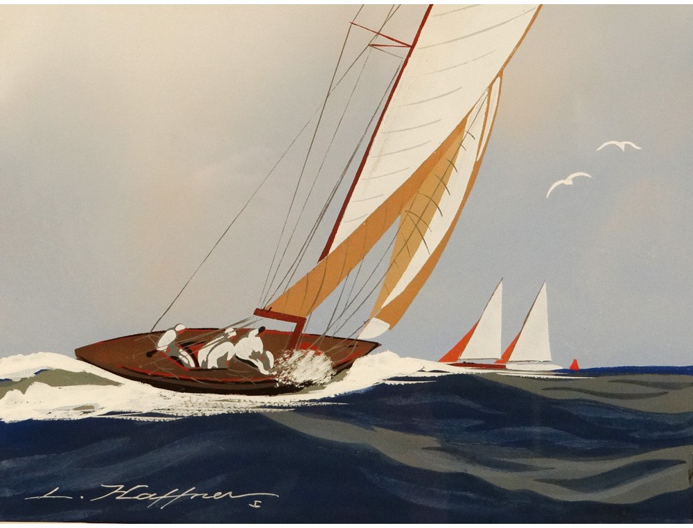 Beautiful gouache depicting a view of a yacht sailing starboard sea boat among others, perhaps at a regatta, signed Leon Haffner * vintage twentieth century.