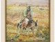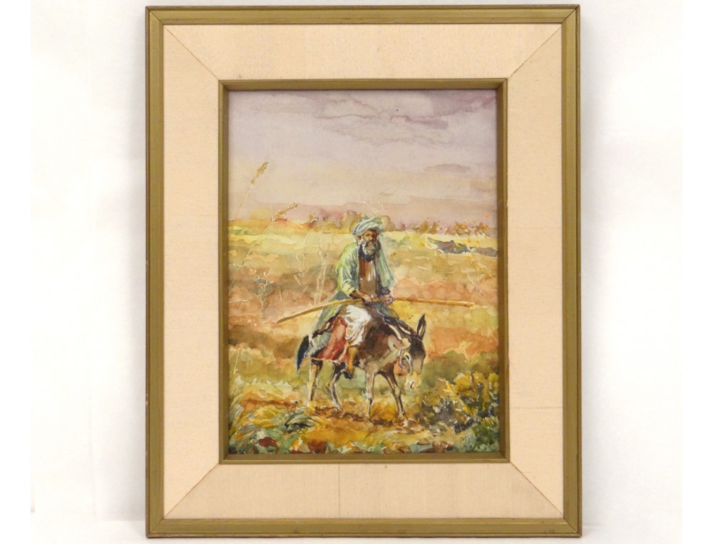 Lovely oriental watercolor of a man riding a donkey walking in a landscape near Peshawar in Pakistan, painted by Colonel Brisgand military physician and amateur painter, time twentieth century.