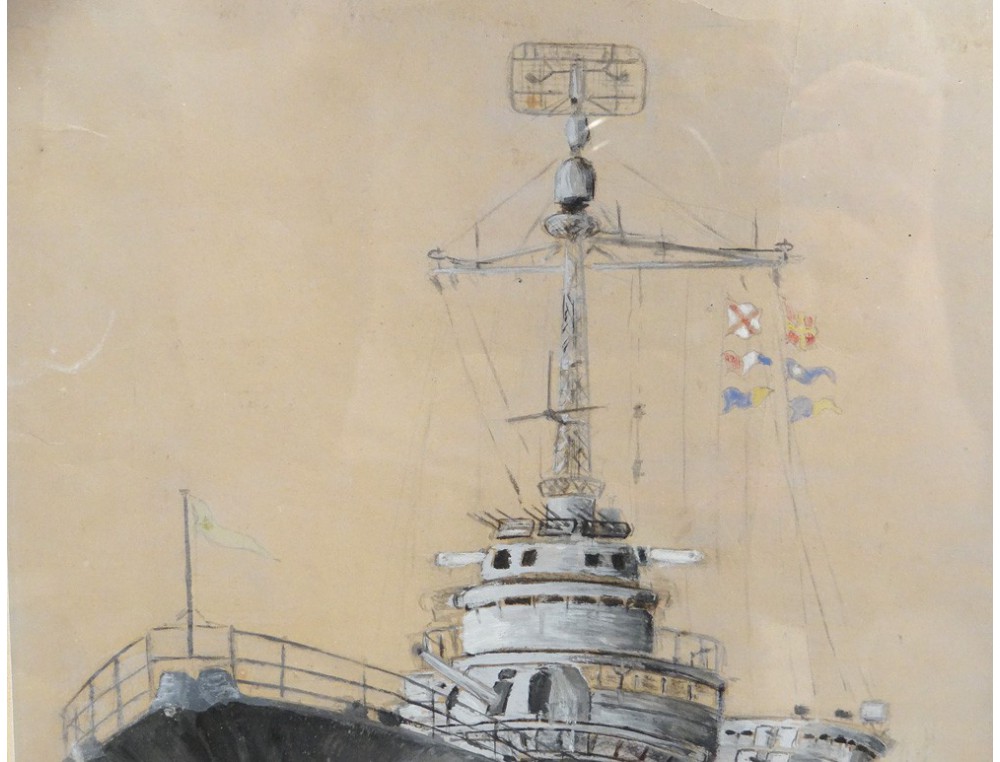 Lovely gouache representing a warship advancing sea at high speed, vintage twentieth century.