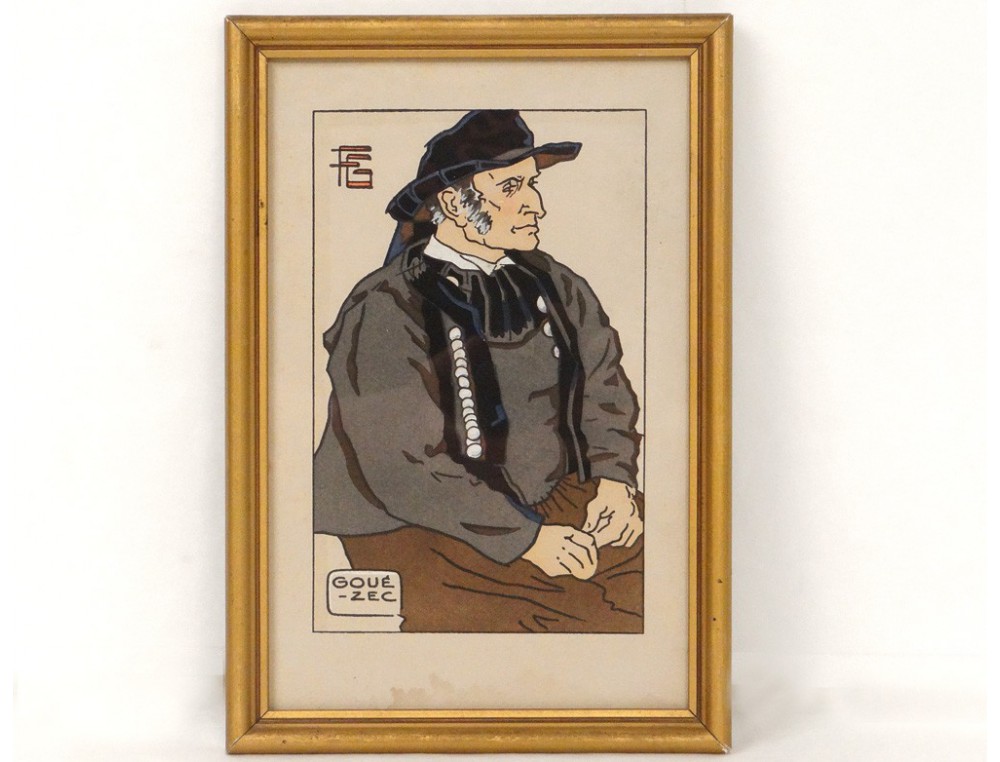 Very pretty stencil gouache representing a man from Gouézec, a town in Finistère in Brittany, in traditional costume with his Breton hat, monogrammed GF for G.Géo-Fourrier *, from the 20th century.