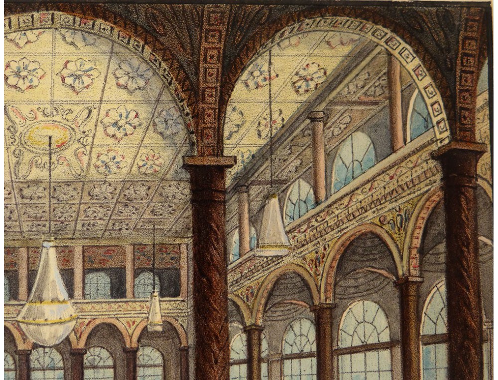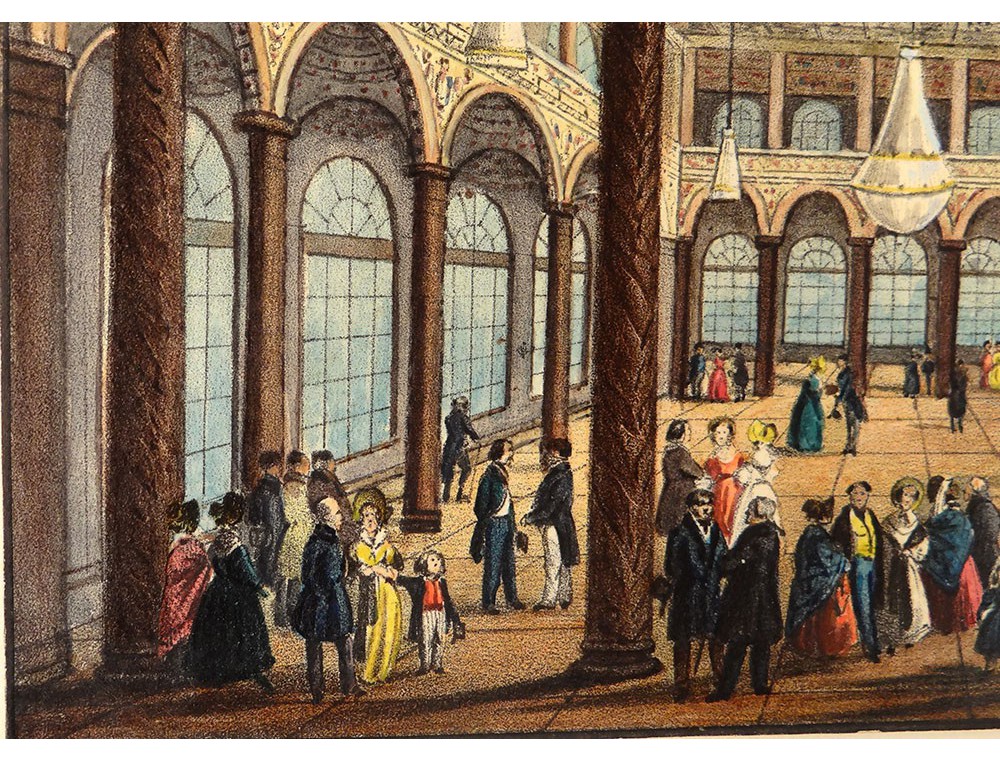 Gouache representative inside a ballroom with many elegantly dressed characters, probably in a castle in Germany (perhaps the Stolzenfels near Koblenz), XIXth century.