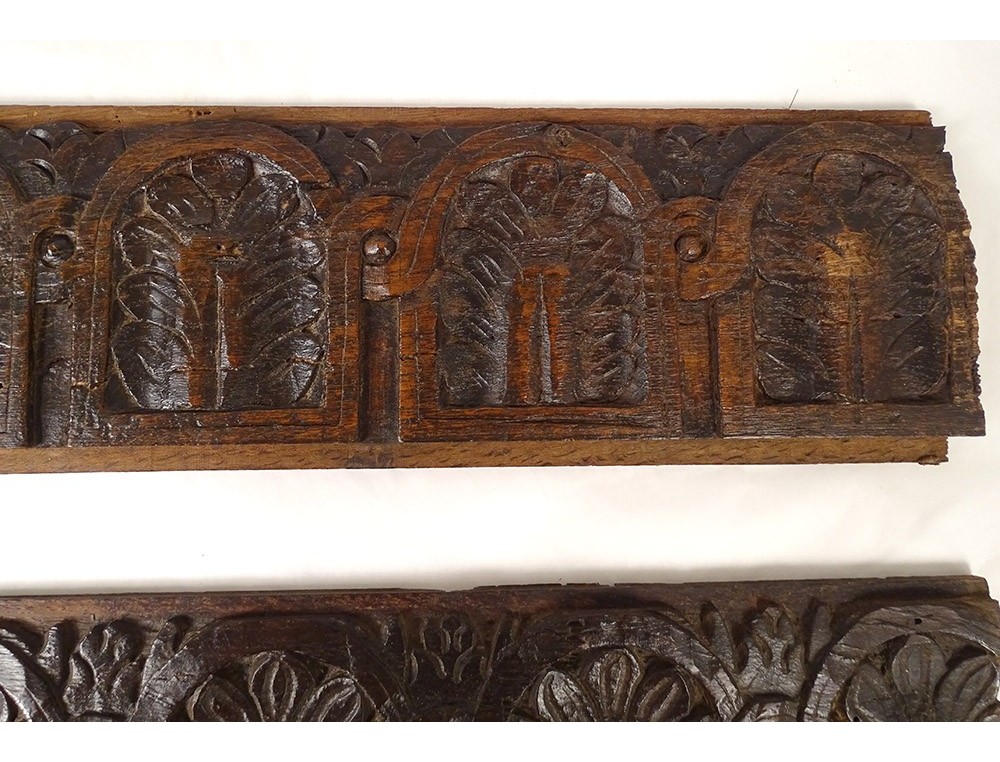 Pair of Haute Epoque panels in carved wood, decorative woodwork, decorated with a frieze of alternating shells and foliage in a winding motif, from the 17th century.