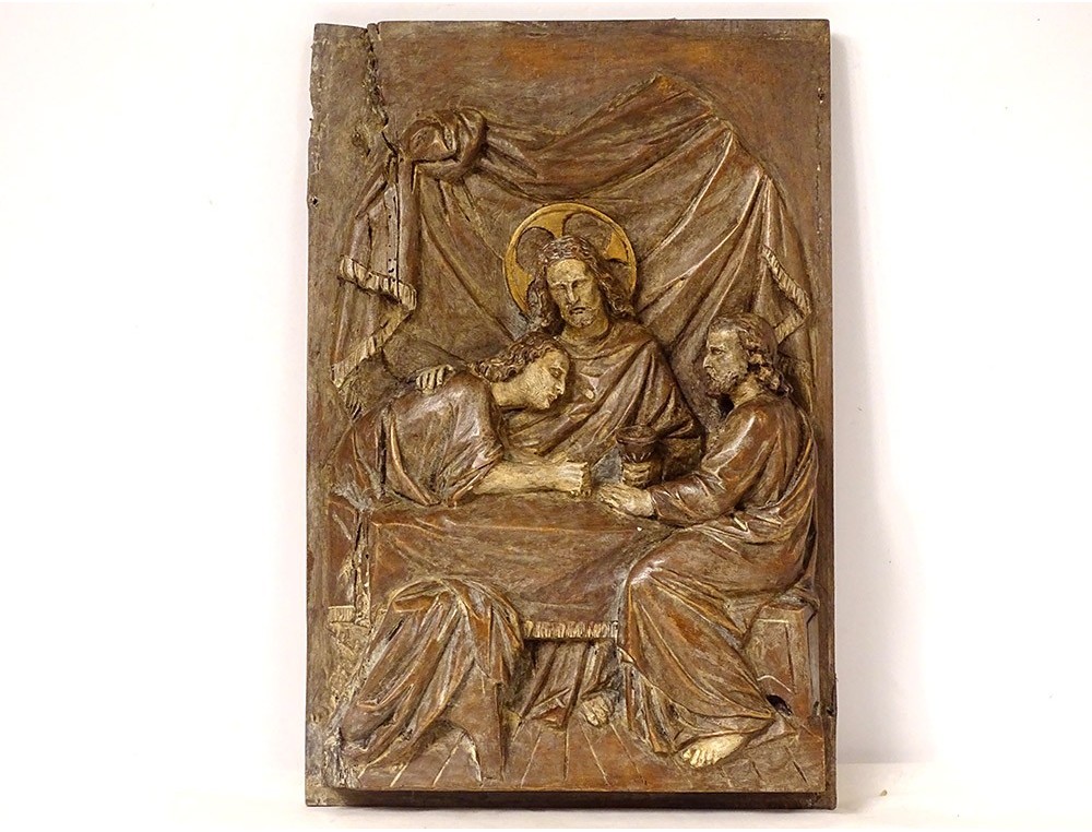 Panel carved in bas-relief representing Christ surrounded by two pilgrims from Emmaus *, XIXth century.