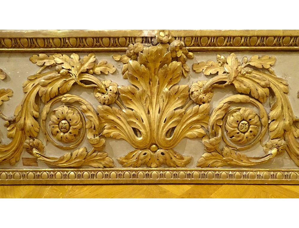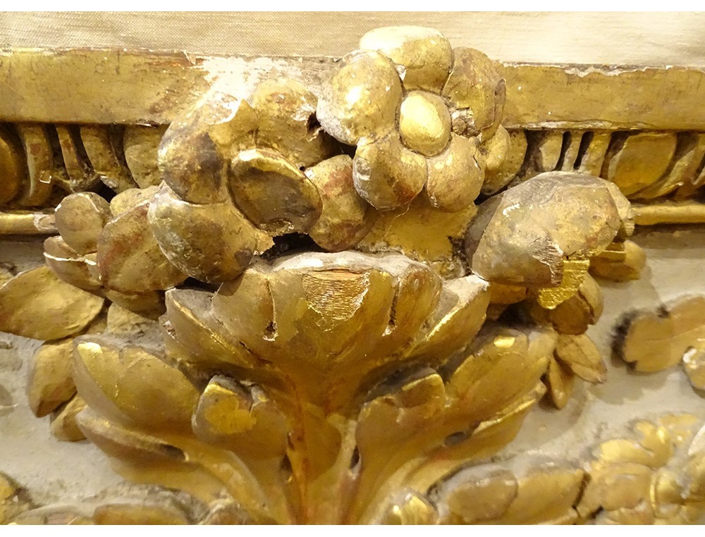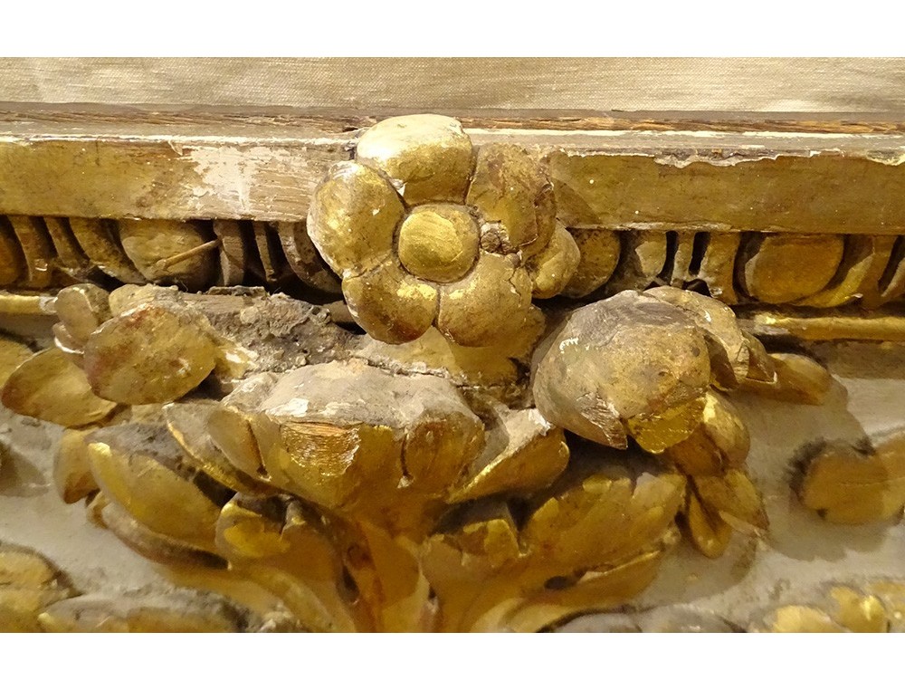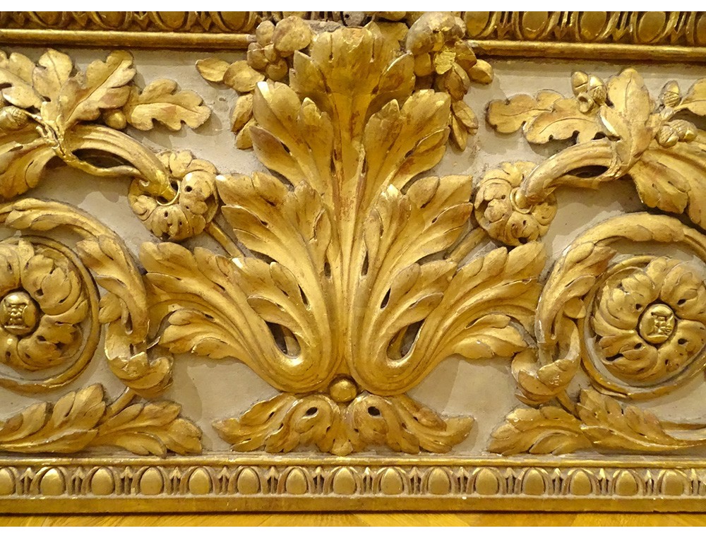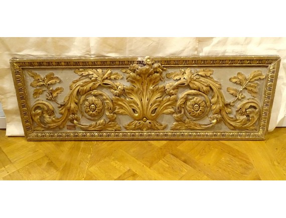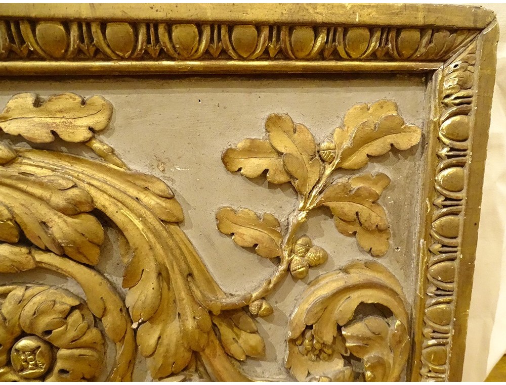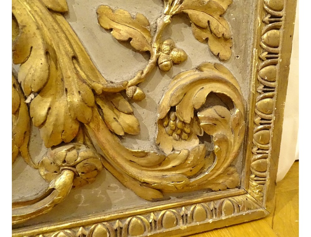 Large decorative panel (perhaps woodwork element, door top), polychrome and gilded carved wood, decorated with a large central acanthus leaf, framed by scrolls of oak leaves, border in frieze of oves , from the 18th century.