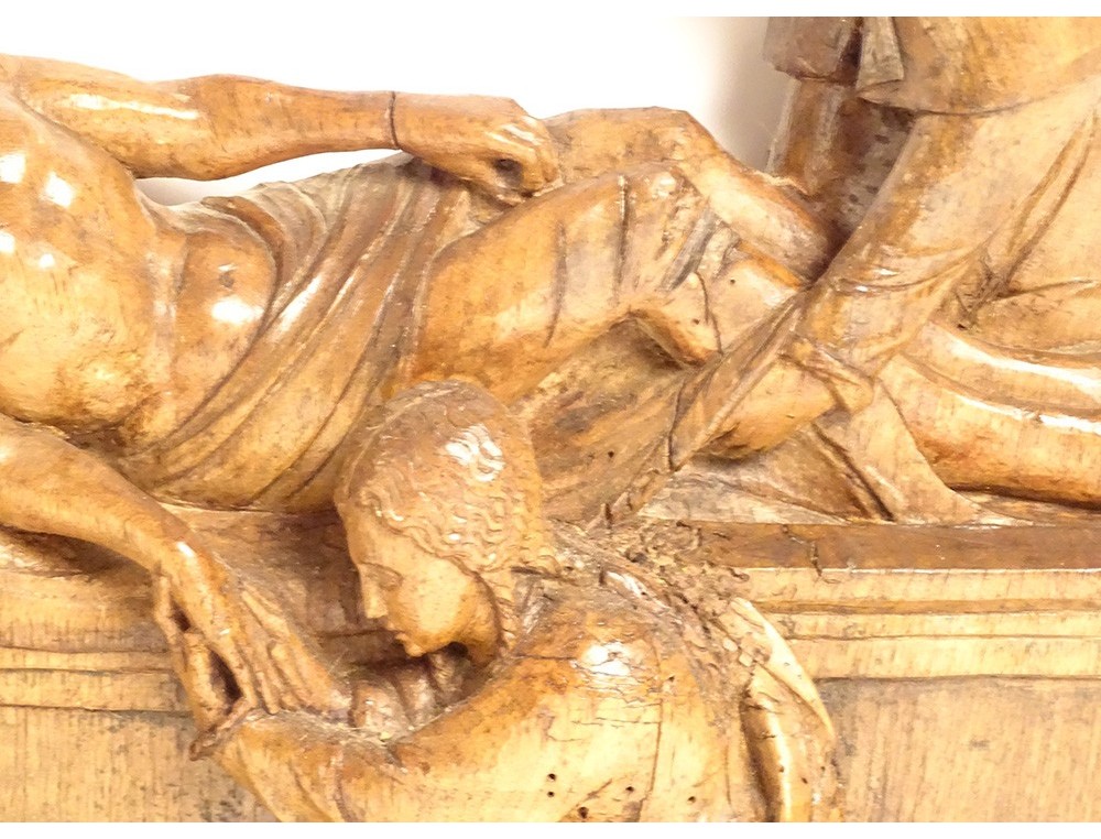 Wooden sculpture representing the scene following the Descent from the Cross and the Deposition of Christ, namely the entombment of Jesus by Nicodemus and Joseph of Arimathea, at his feet the Virgin Mary known as of Mercy (Pietà) kneeling (scene of Lamentation), from the 17th century.