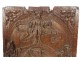 Haute Epoque panel in carved oak, representing a character (a Saint martyr?) walking accompanied by characters (a woman and a child in front of him, a young man behind); above a man holding ribbons (with inscriptions), perhaps the representation of the Resurrection of Saint-Lazare, from the XVIth-XVIIth centuries.