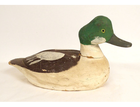 Duck decoy in polychrome carved wood, work of folk art, from the late 19th-early 20th centuries.