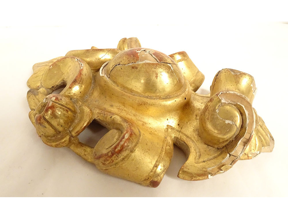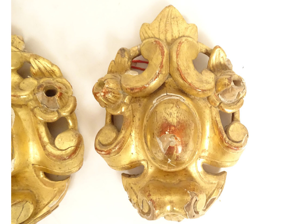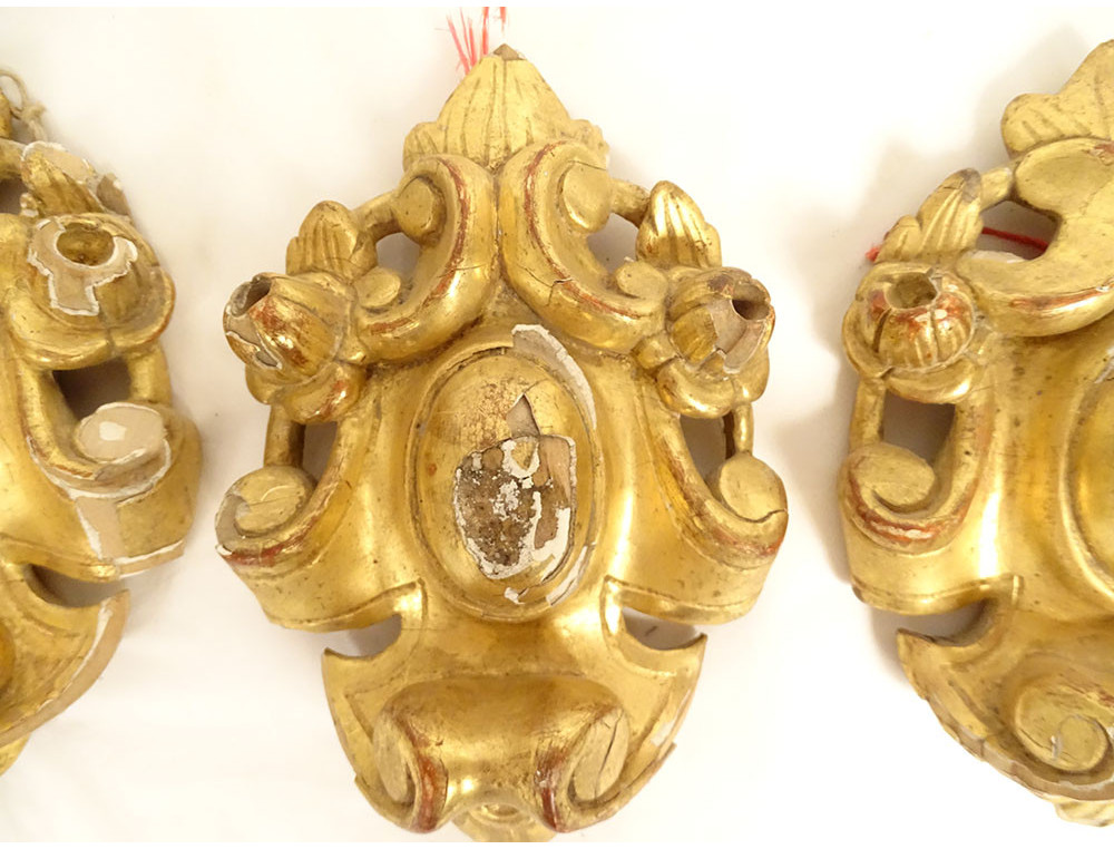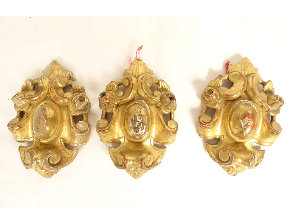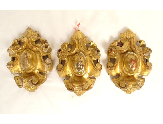 Set of three decorative elements in gilded wood, ornamentation or woodwork, decorated with medallions and stylized foliage, from the 18th century.