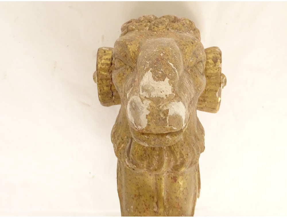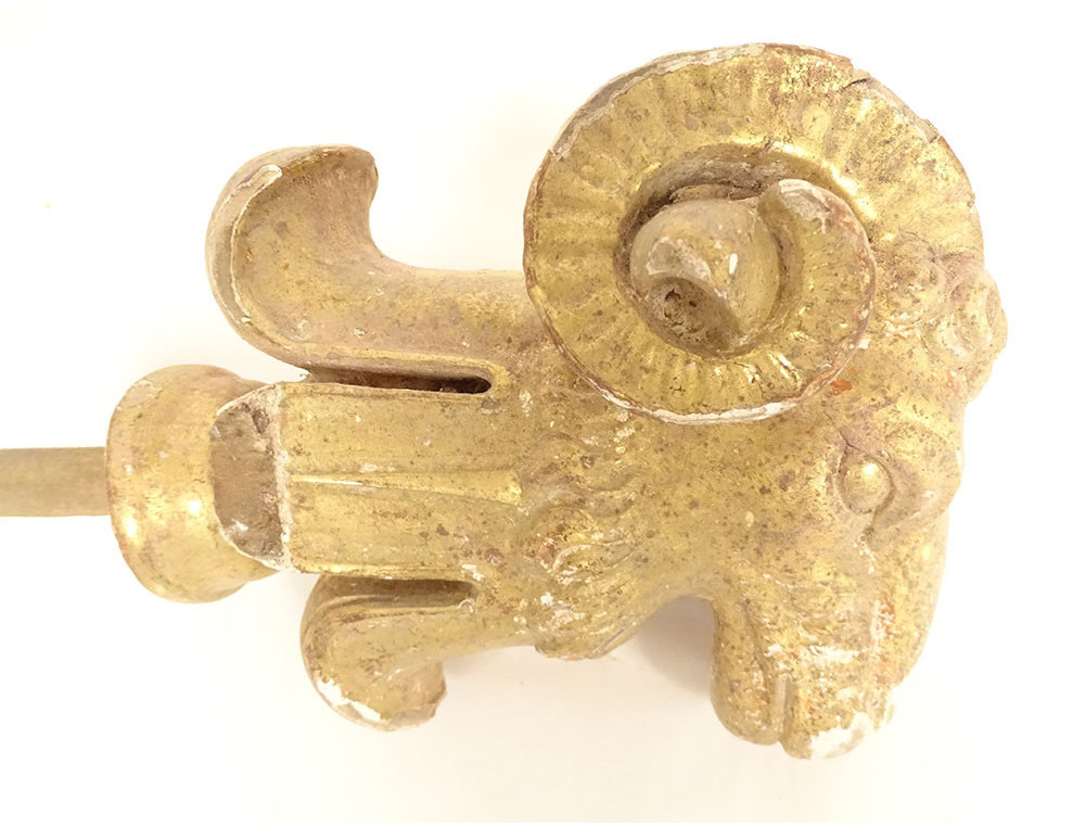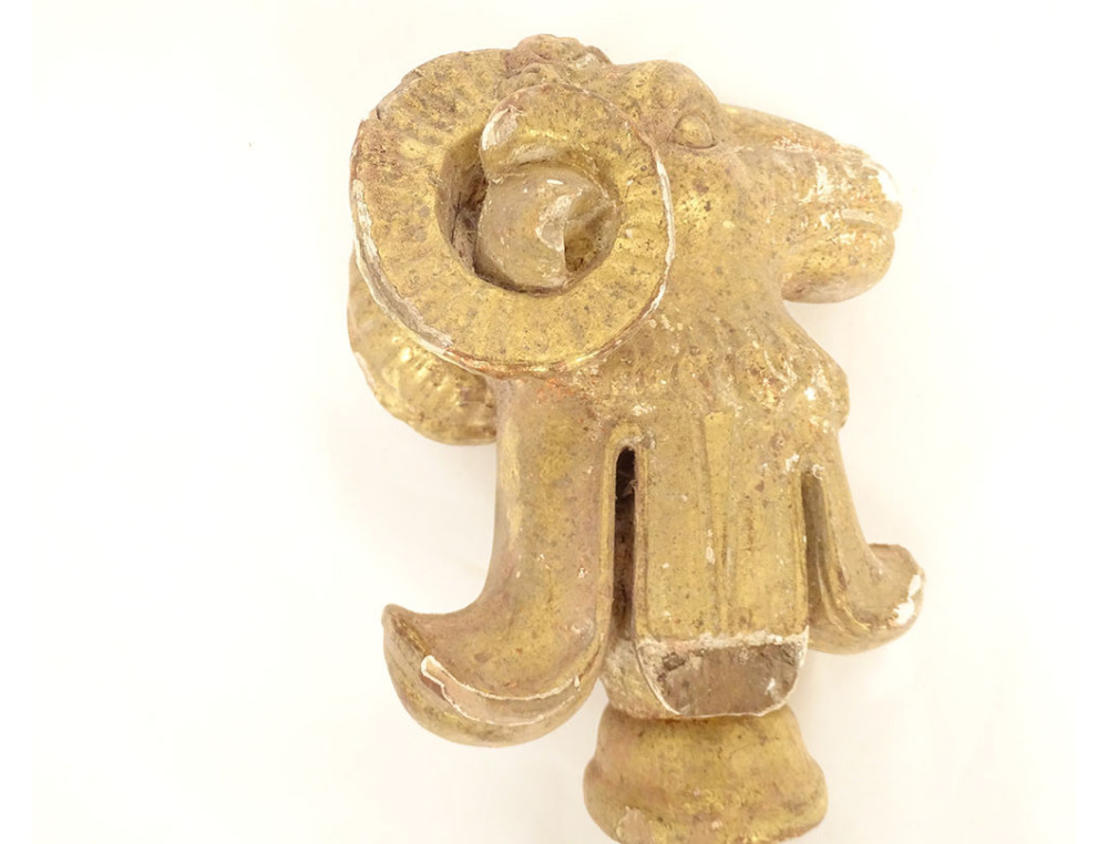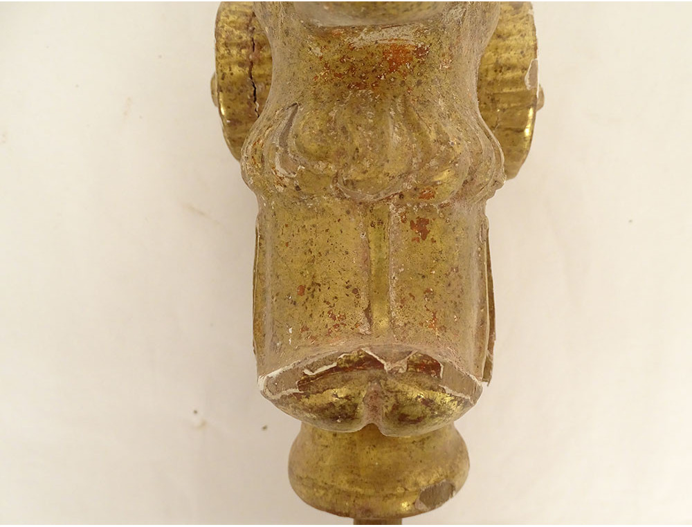 Pair of decorative elements (curtain ties) in carved gilded wood, depicting two rams' heads, from the late 18th-early 19th centuries.