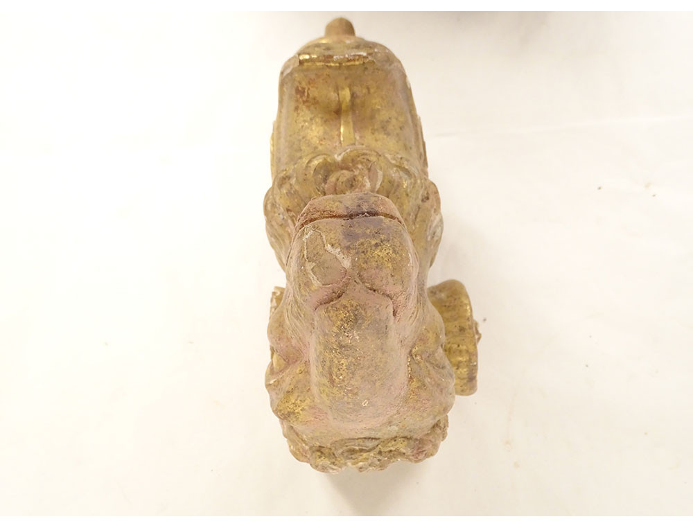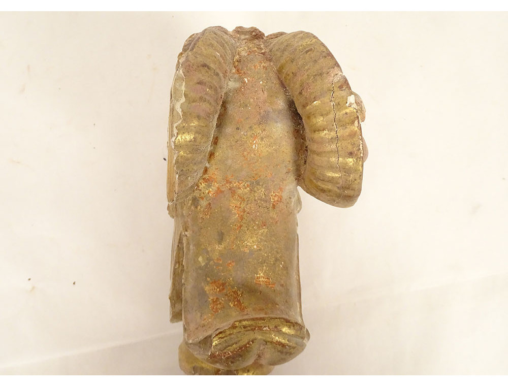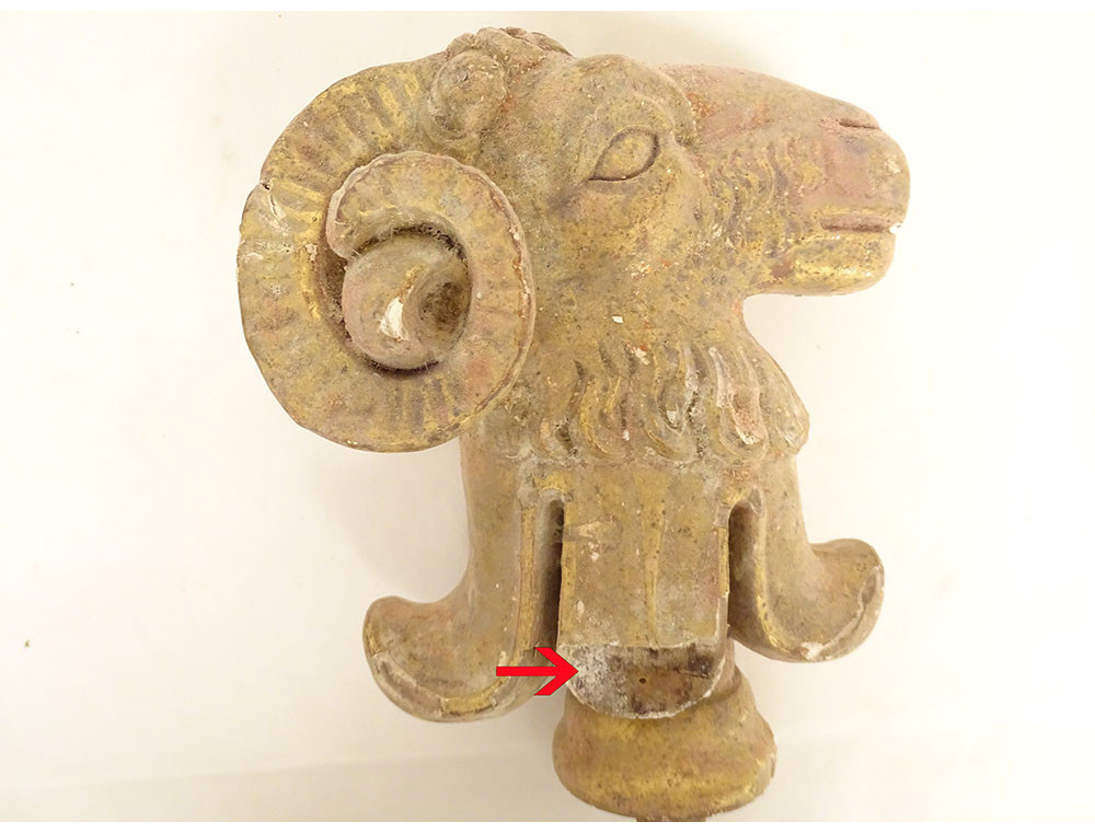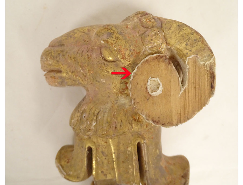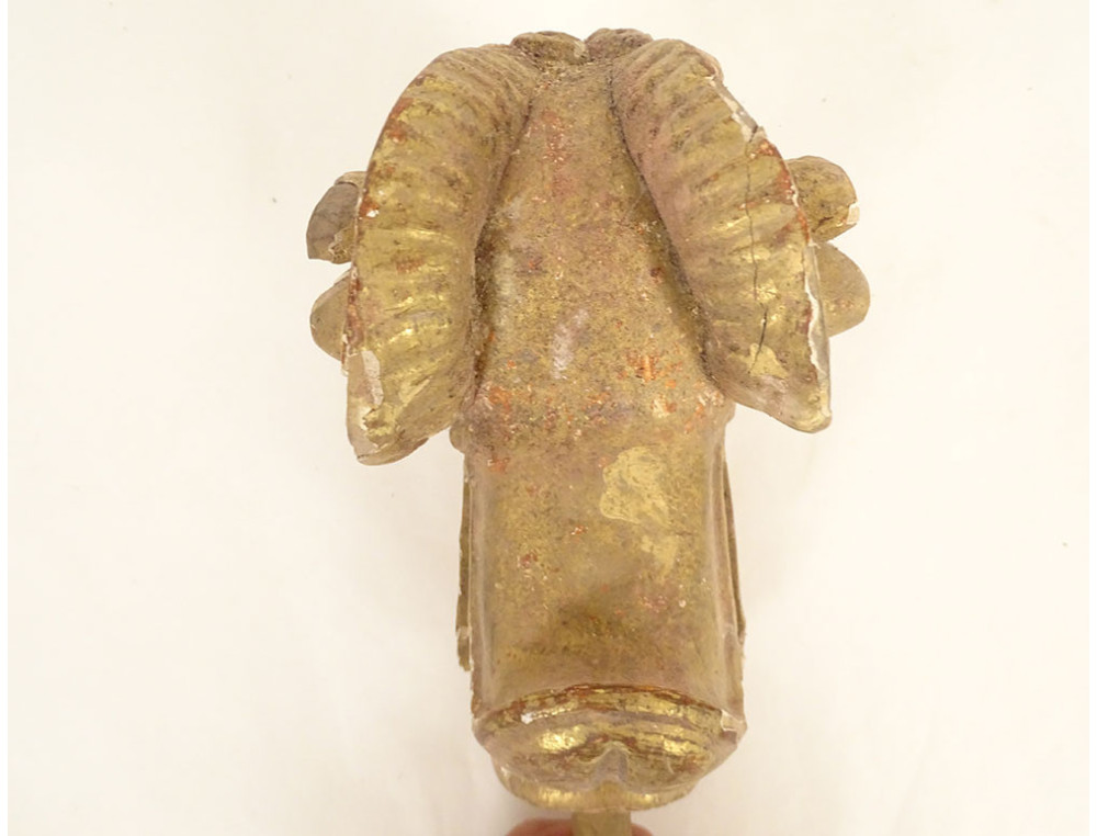 Pair of decorative elements (curtain ties) in carved gilded wood, depicting two rams' heads, from the late 18th-early 19th centuries.