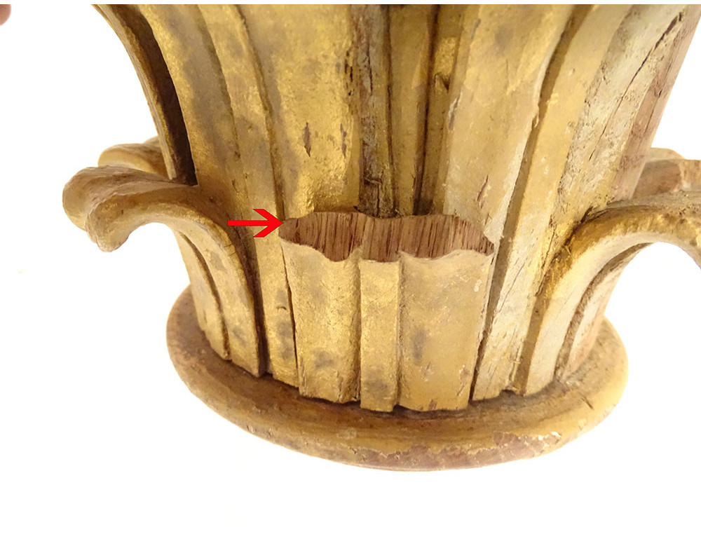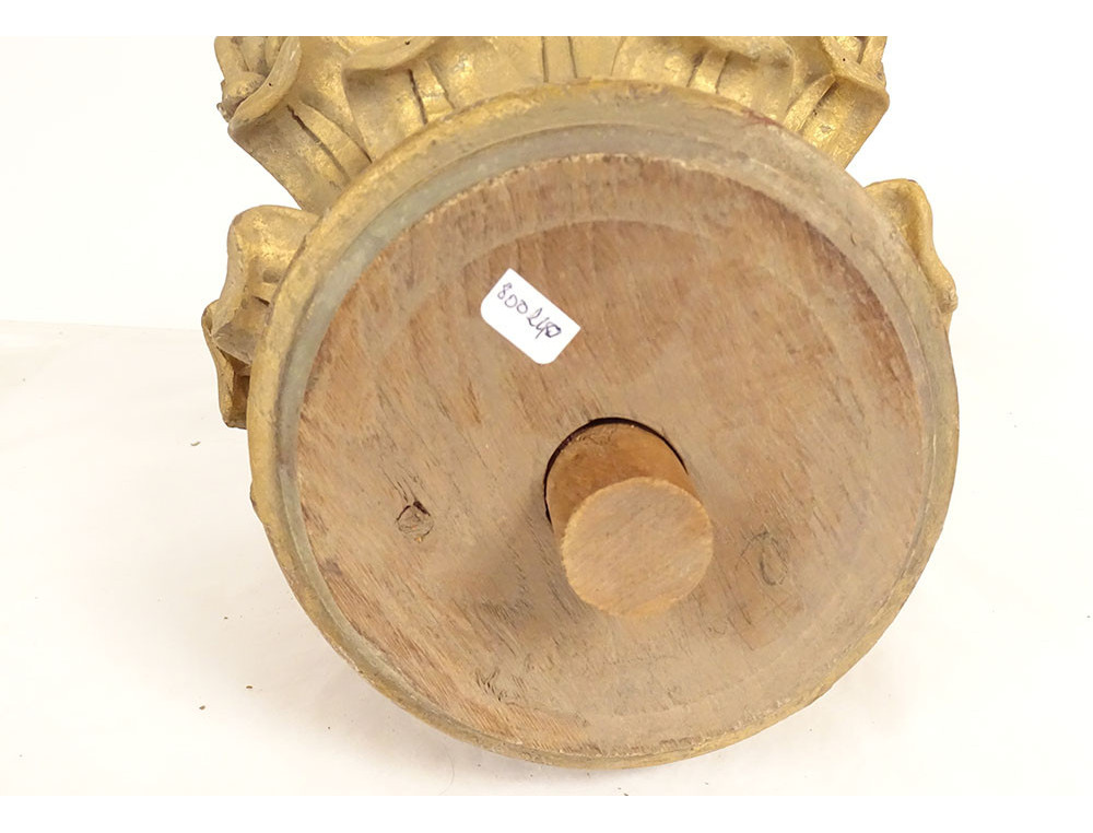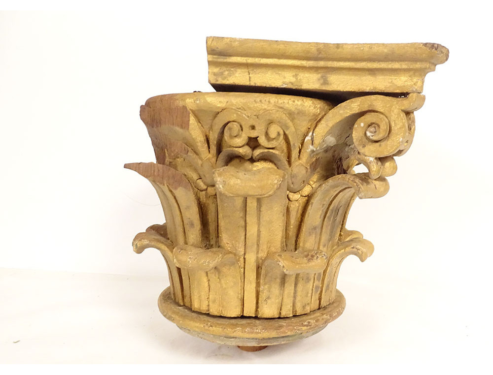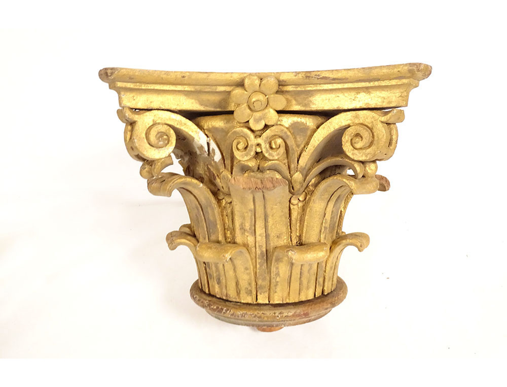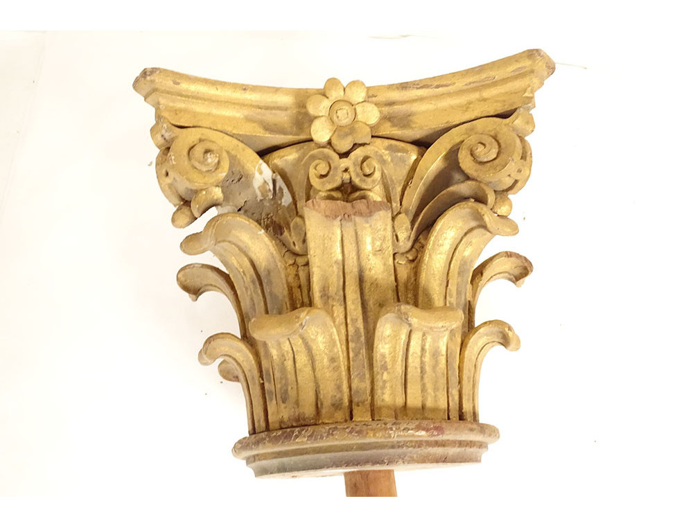 Small Corinthian capital in carved gilded wood decorated with stylized acanthus leaves, scrolls and small flowers, from the 19th century.