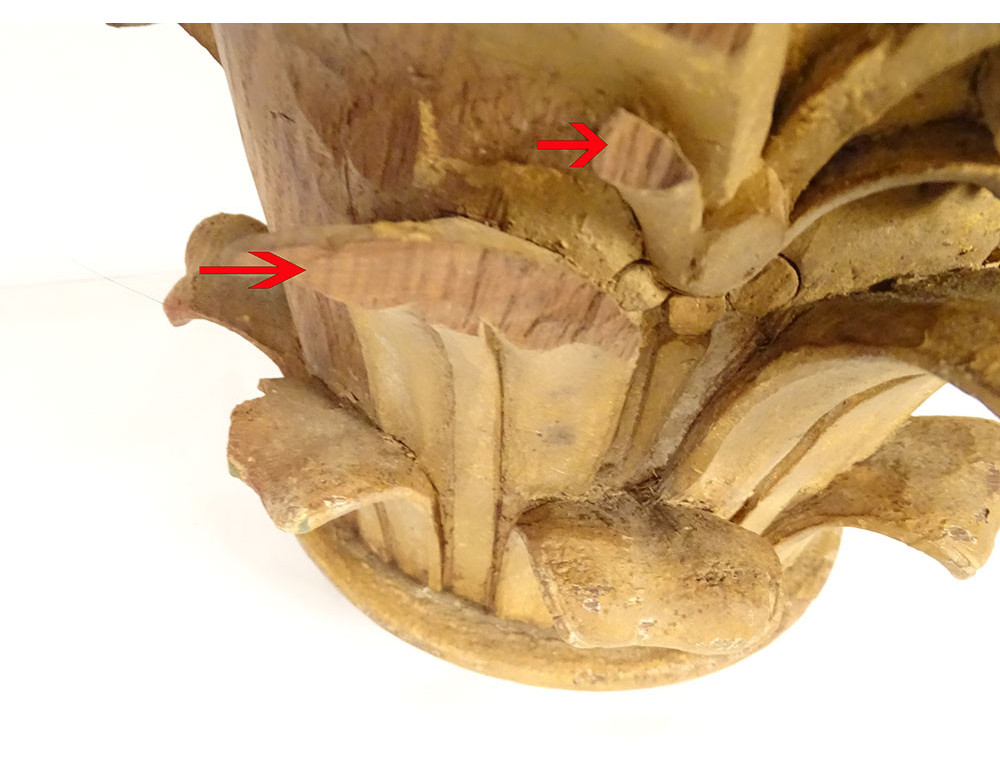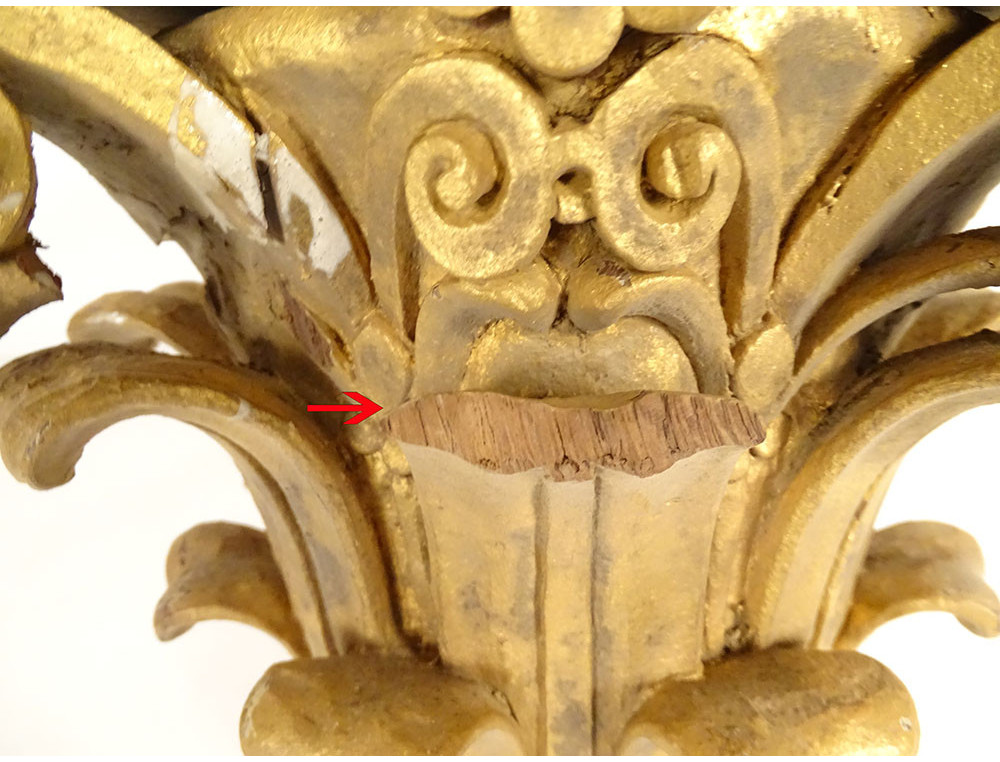 Please note: accidents and missing wood on the decorations (see red arrows), wear to the gilding, cracks and wear of time in the wood, see photos.