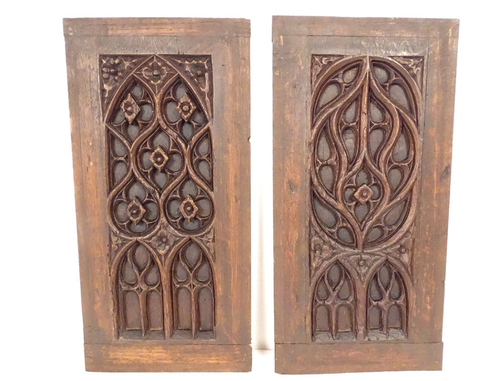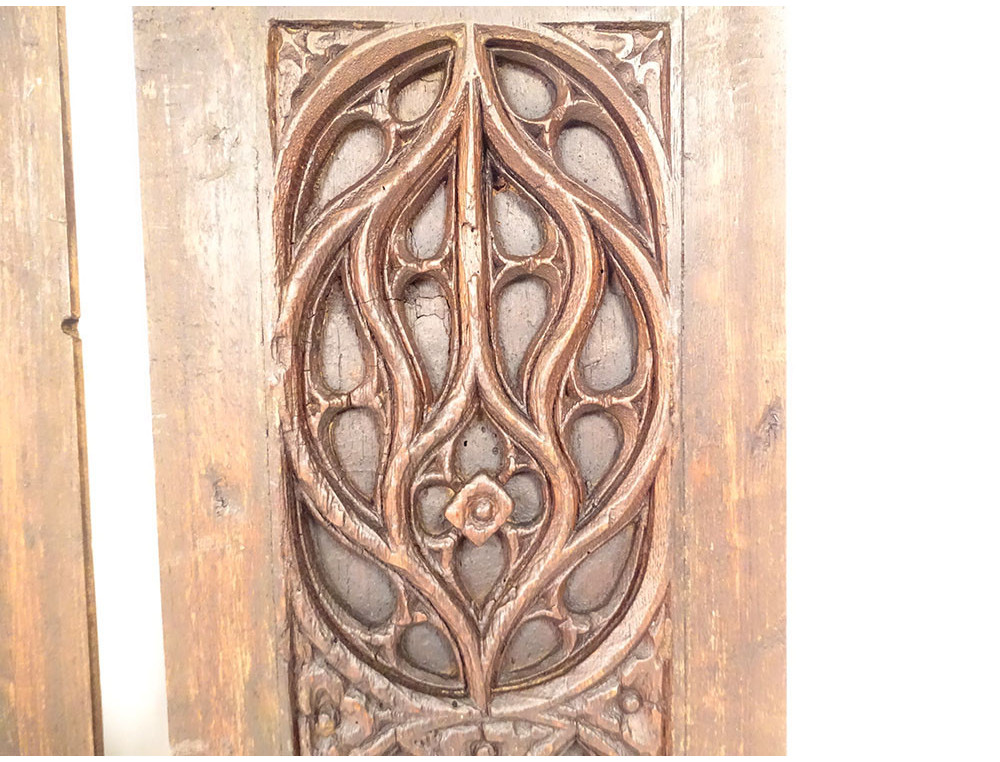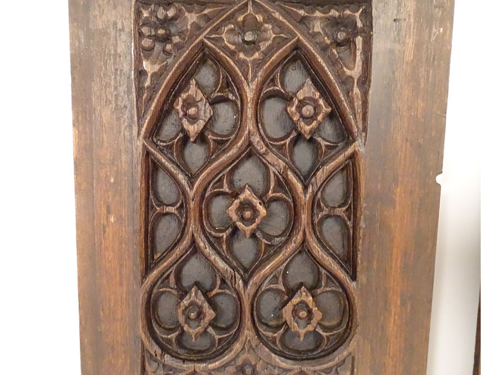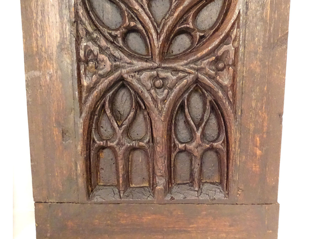 Two High Period carved wooden panels in the flamboyant Gothic style with window decoration of bellows and mouchettes and plant motifs, dating from the 16th-17th centuries.