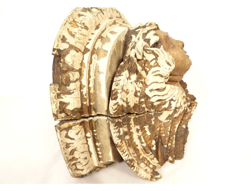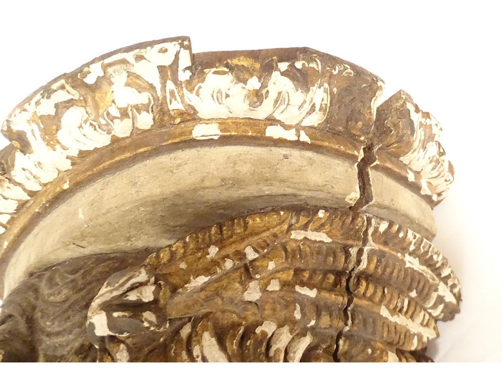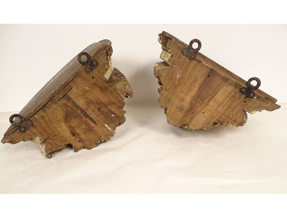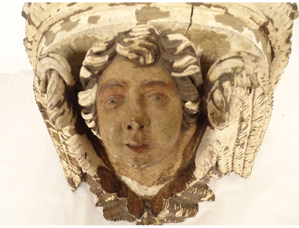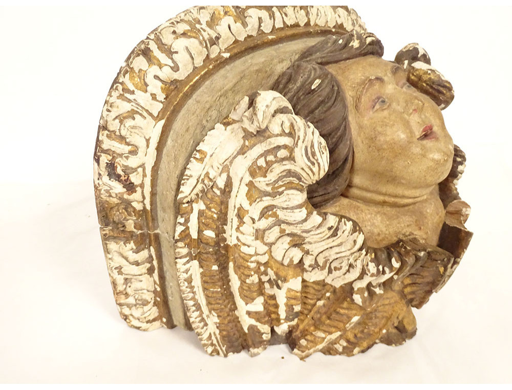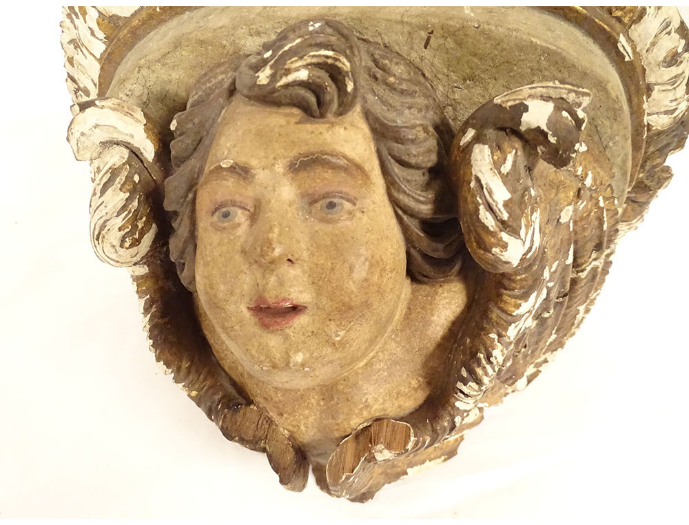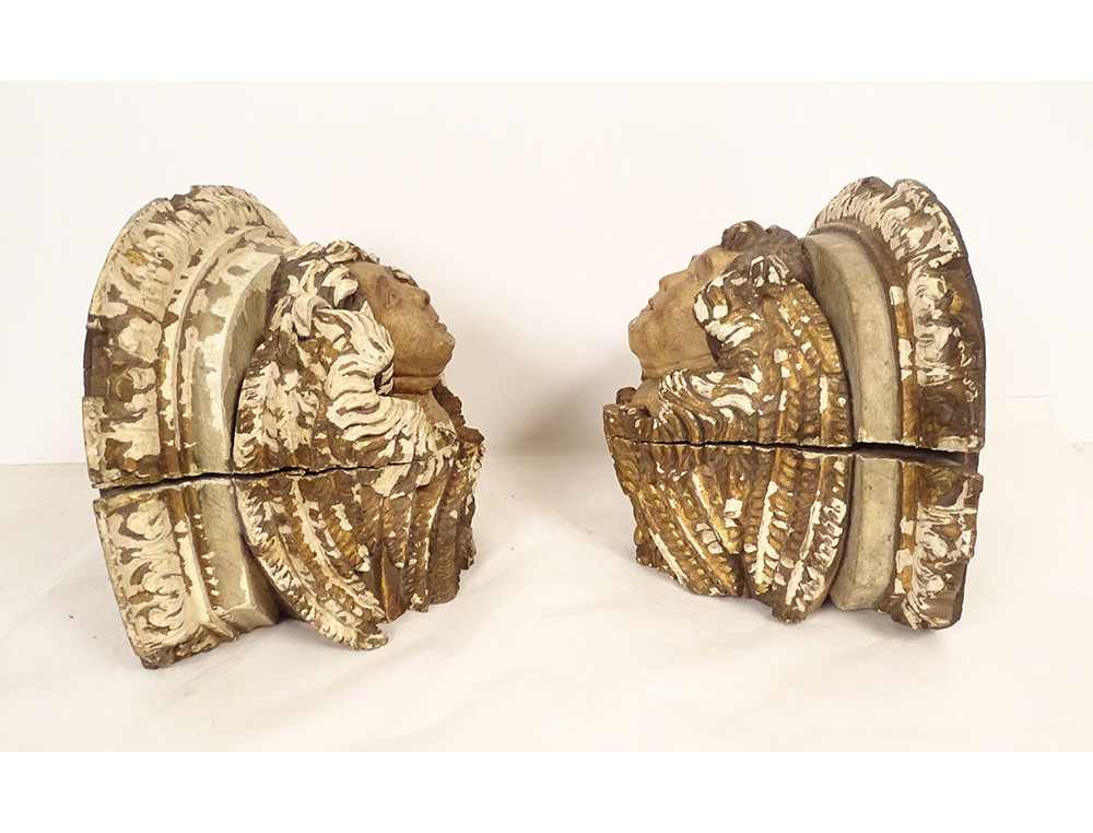 Pair of polychrome and gilded carved wooden wall brackets*, decorated with two cherub heads surrounded by foliage and ears of wheat, from the 18th century.