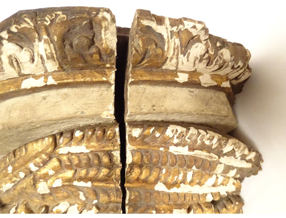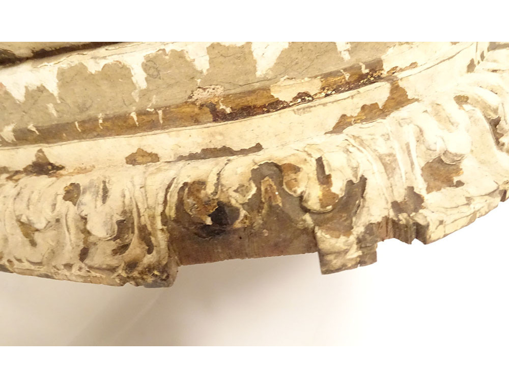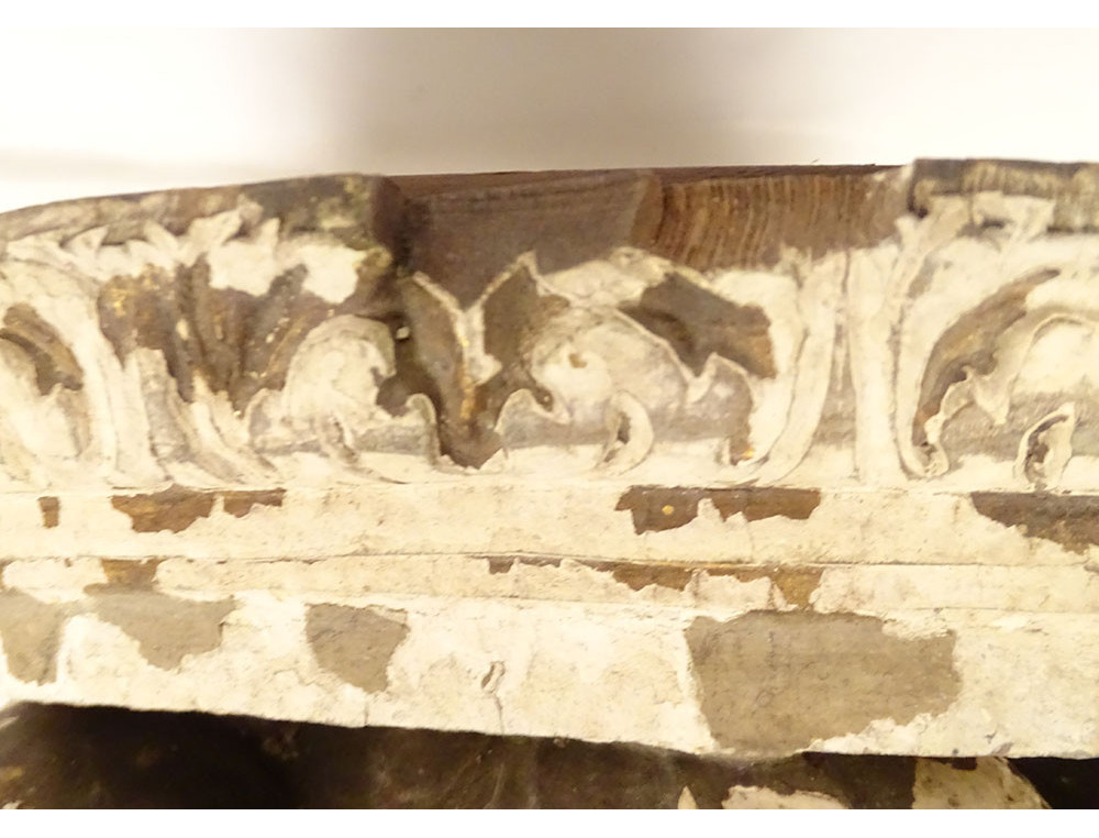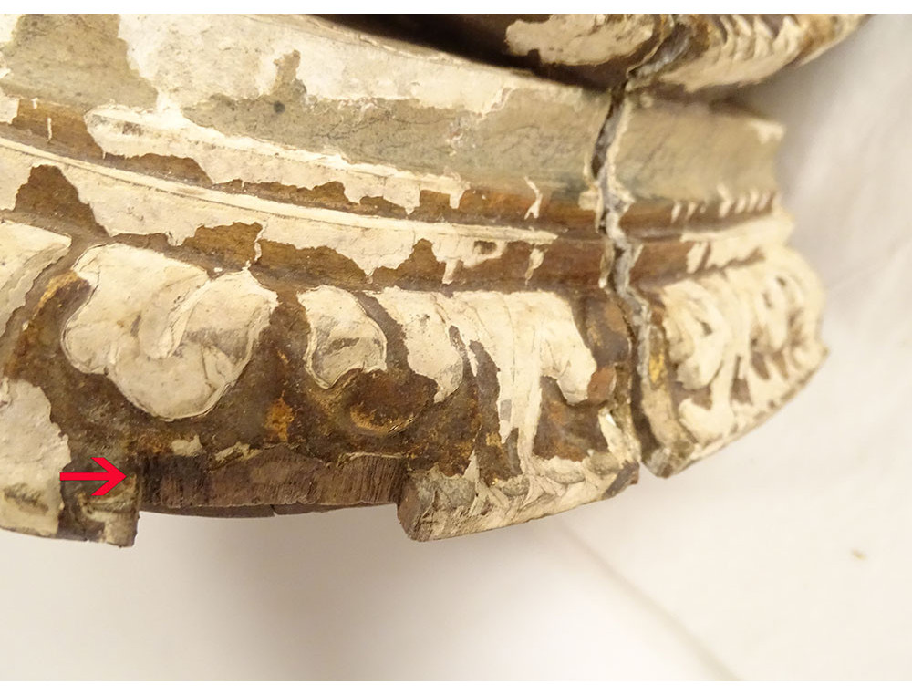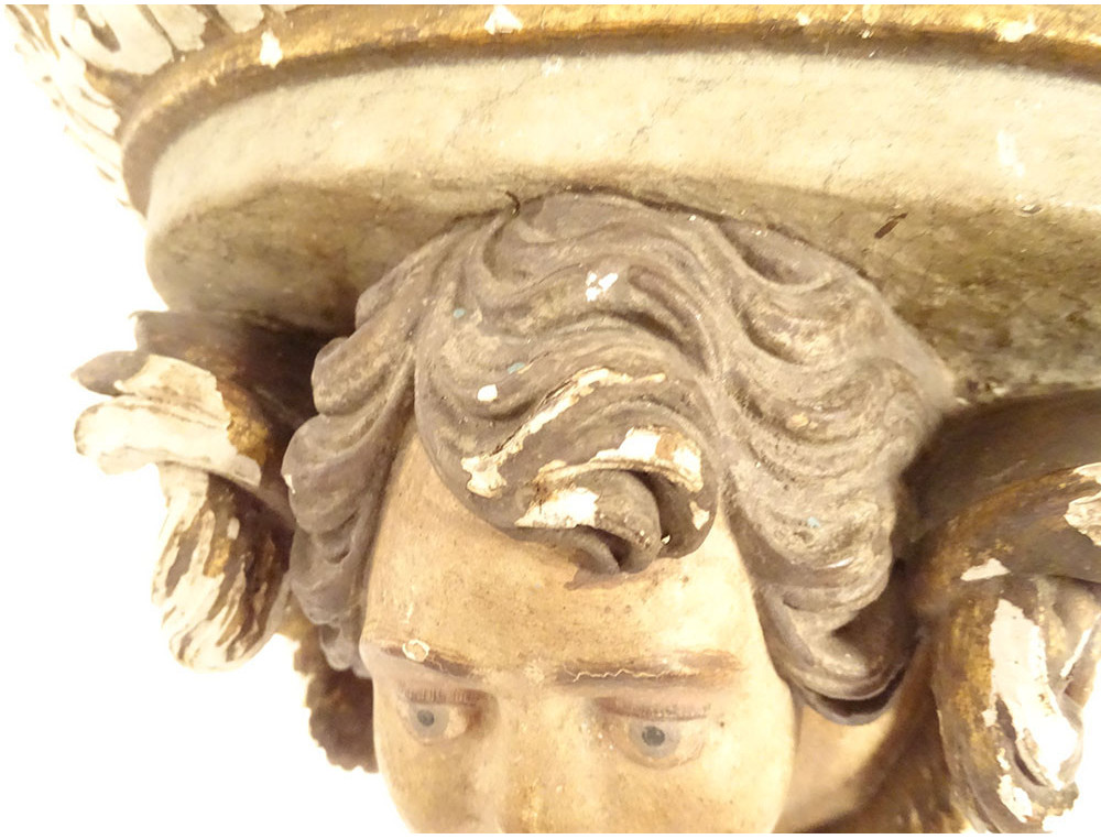 Note: splits in the wood halfway up, some damage and missing wood especially at the edges of the tray and under the angel heads, wear to the polychromy and gilding, wear from age, look carefully at the photos (see red arrows).