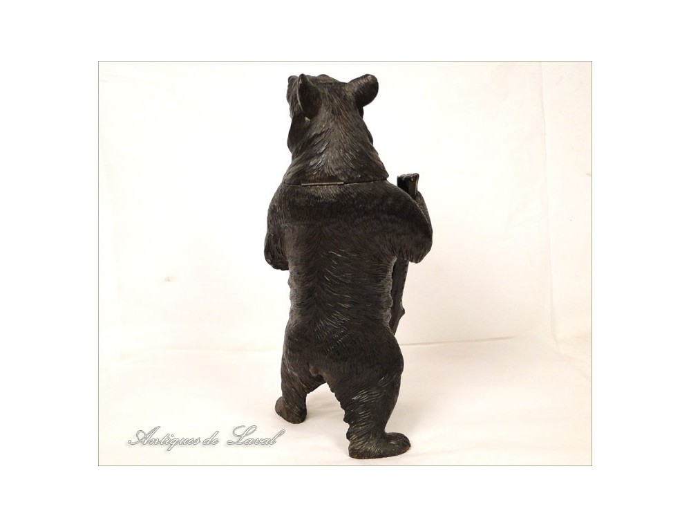 Original tobacco jar carved Black Forest * (Black Forest) representing a large bear standing holding on to a tree trunk and carrying his leg in a jar for honey, XIXth century.