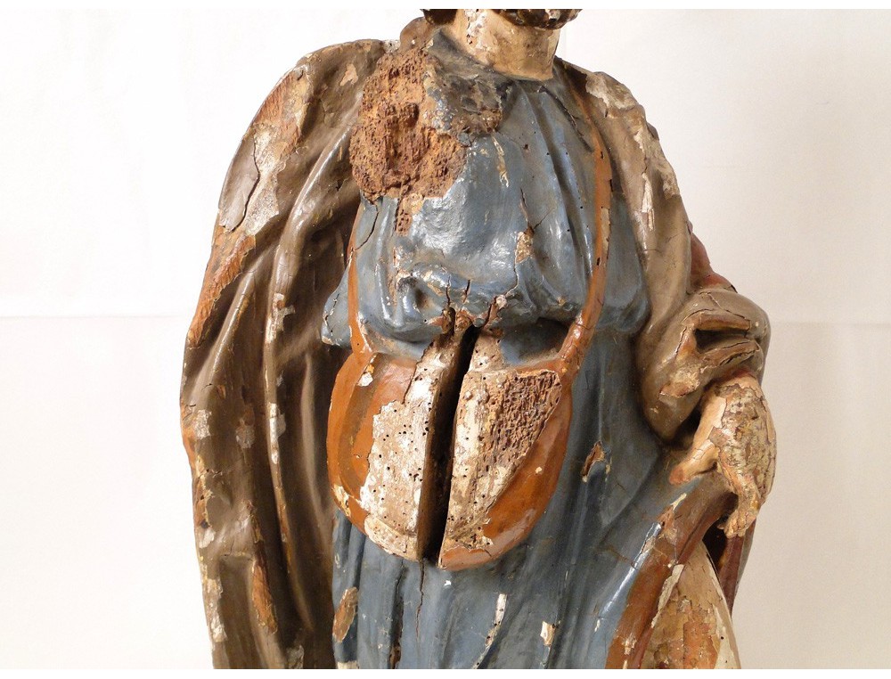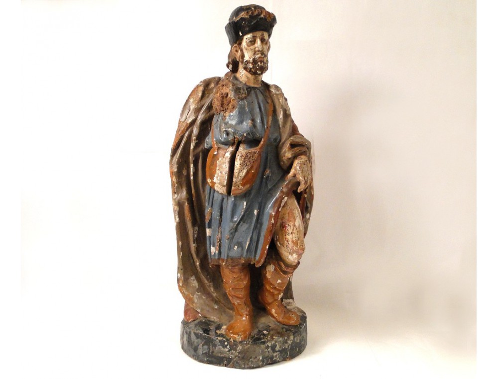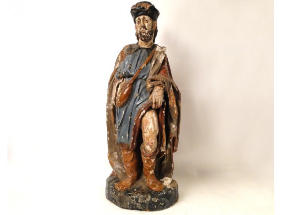 Carved polychrome wooden statue representing St. Rocco *, with his wallet and his pilgrim's cloak, showing the wound in his left leg, symbol of the Holy fighting against the plague, of XVIIth century.