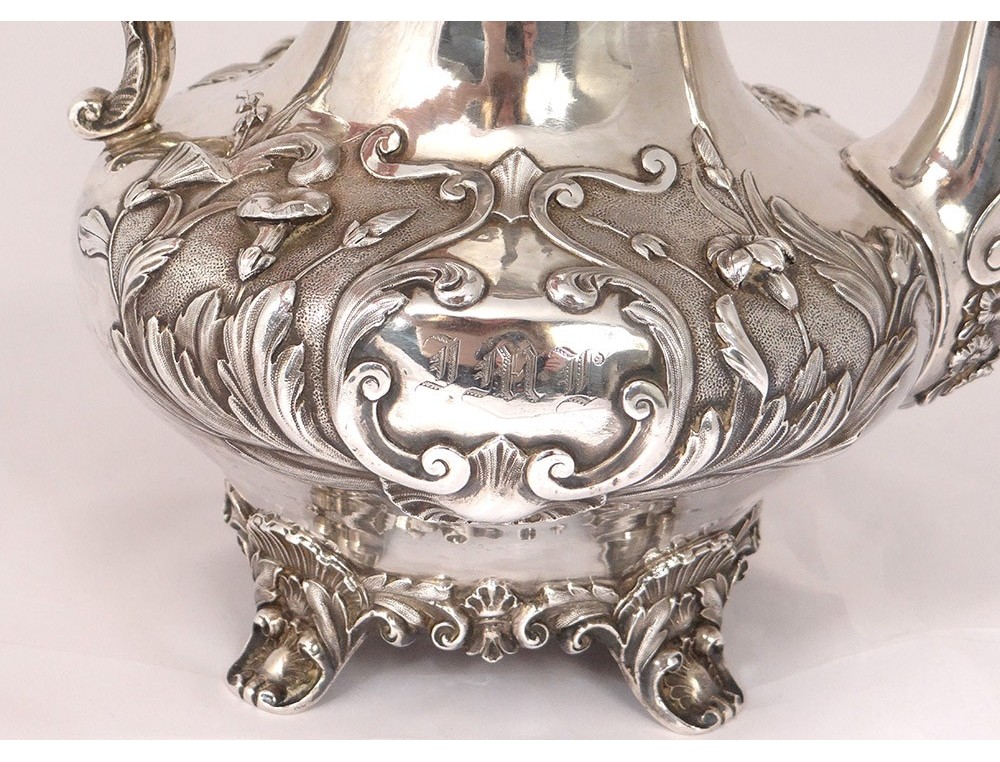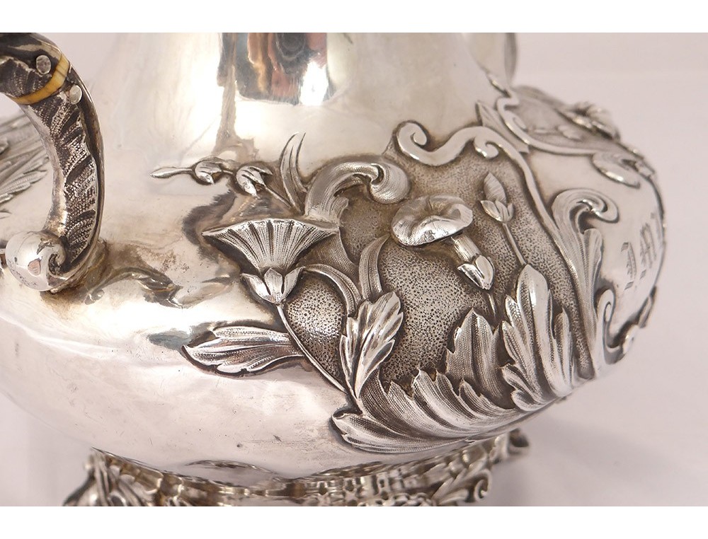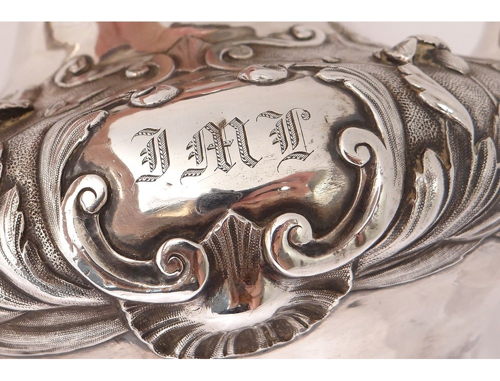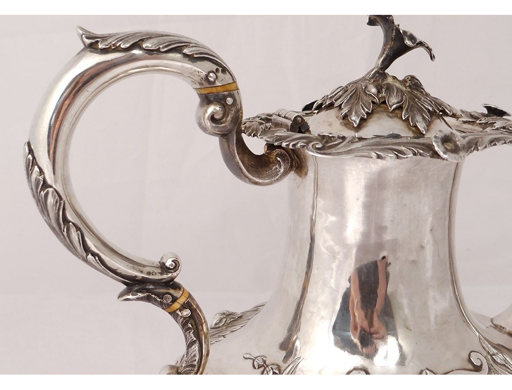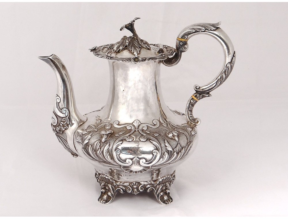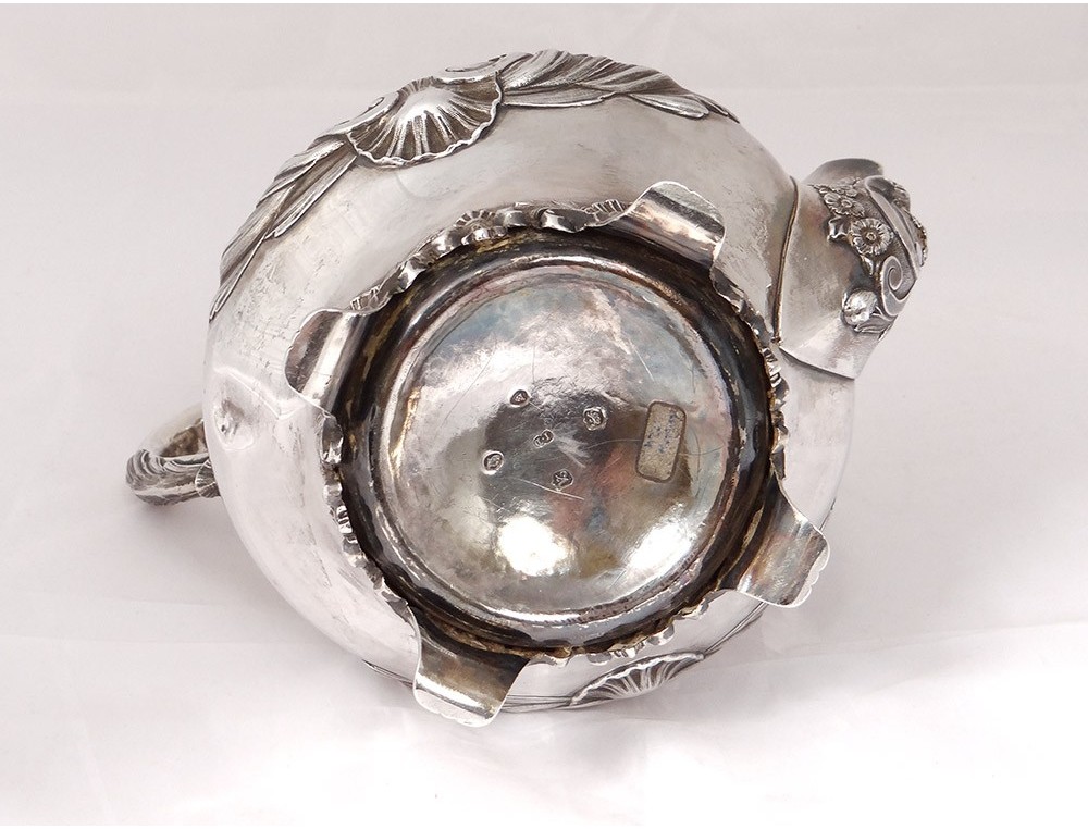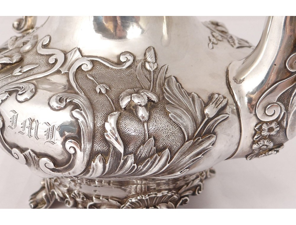 English carver or teapot in finely chiseled English silver, richly decorated with flowers, shells and vegetal arabesques, engraved with a monogram and a greyhound on the body, English punch 1836 London and goldsmith IT for John Tapley * , period first half nineteenth century.