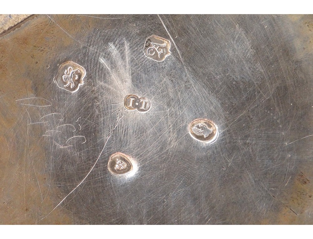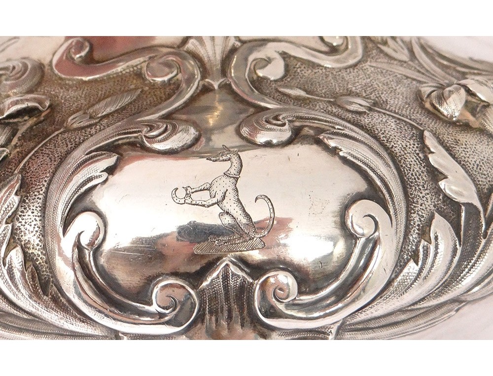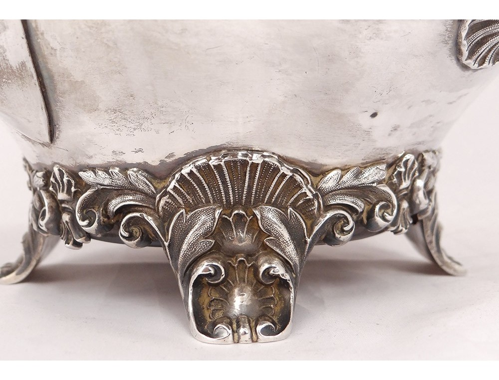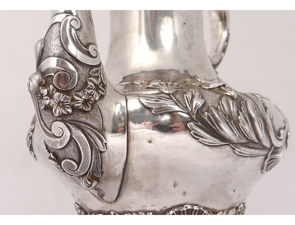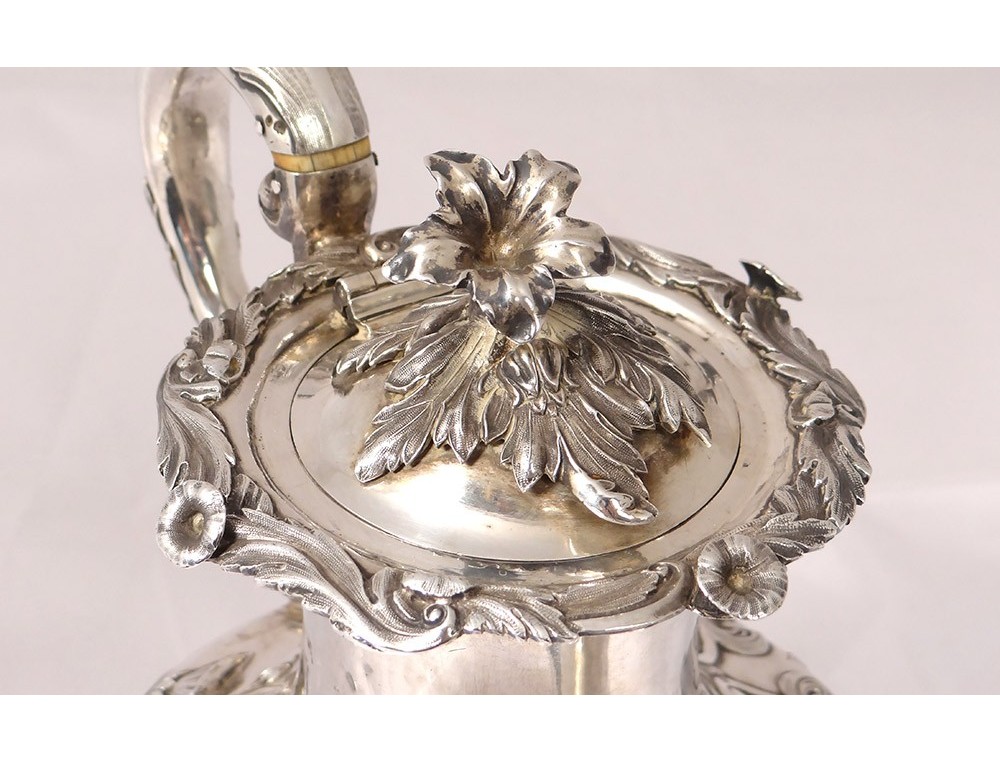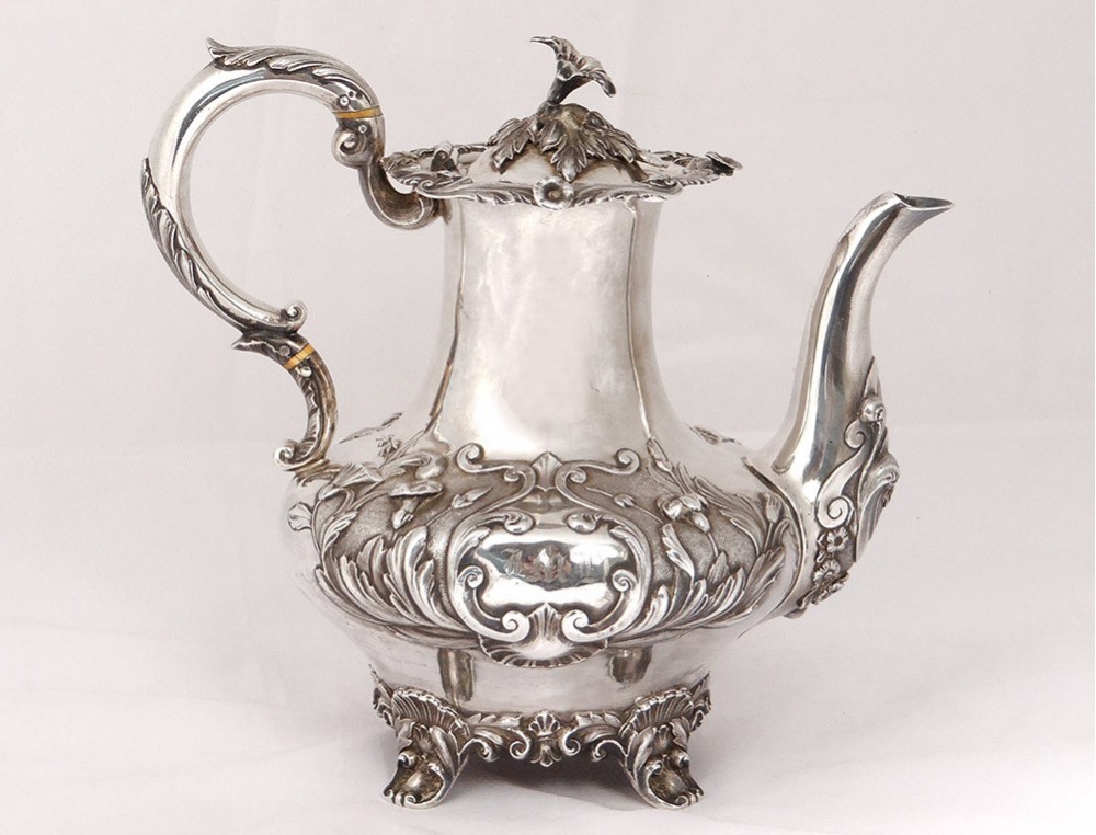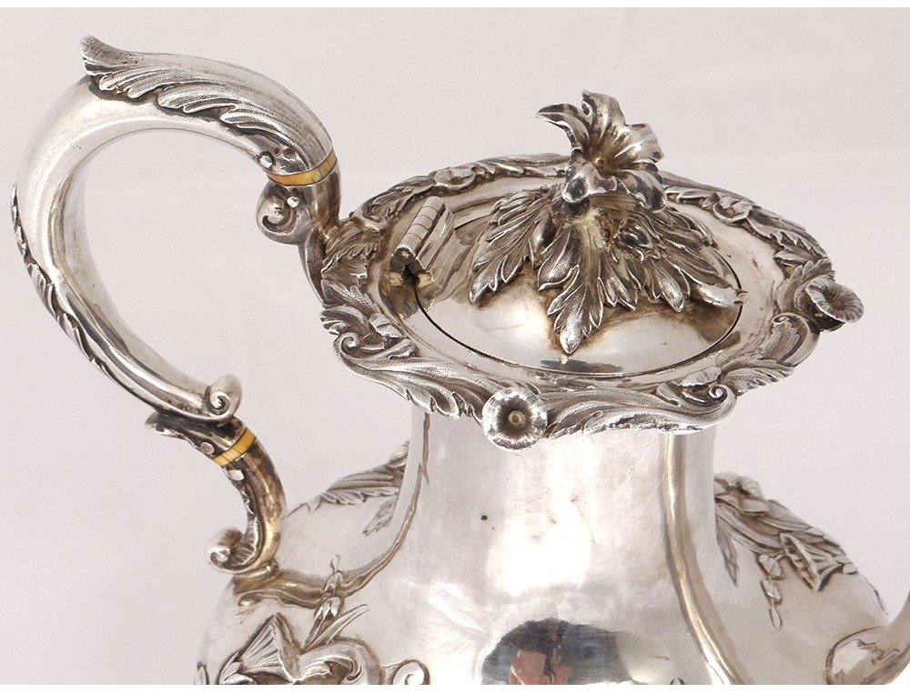 English carver or teapot in finely chiseled English silver, richly decorated with flowers, shells and vegetal arabesques, engraved with a monogram and a greyhound on the body, English punch 1836 London and goldsmith IT for John Tapley * , period first half nineteenth century.