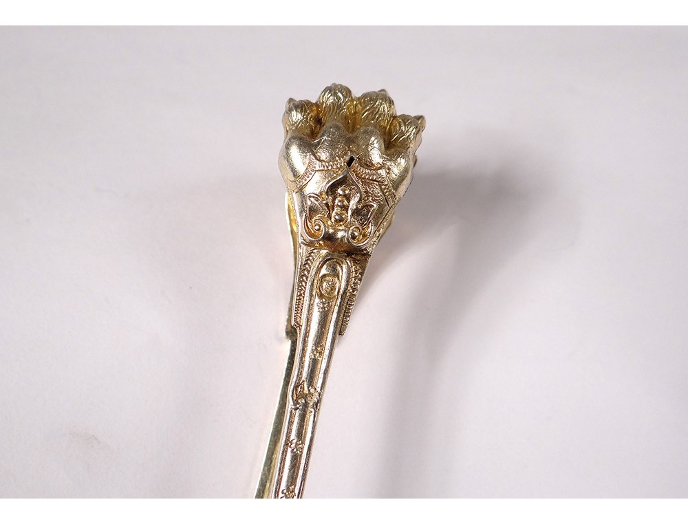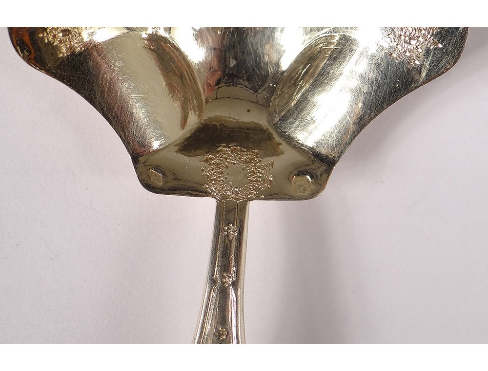 This service is in good condition. Spoons are punched Minerva (1st title) and silversmith Georges Delaporte, punch goldsmith different for the other elements (AV for the pliers and spoon sprinkle, PB? For the tea-strainer), but this is well on same model (same decor and same monogram).