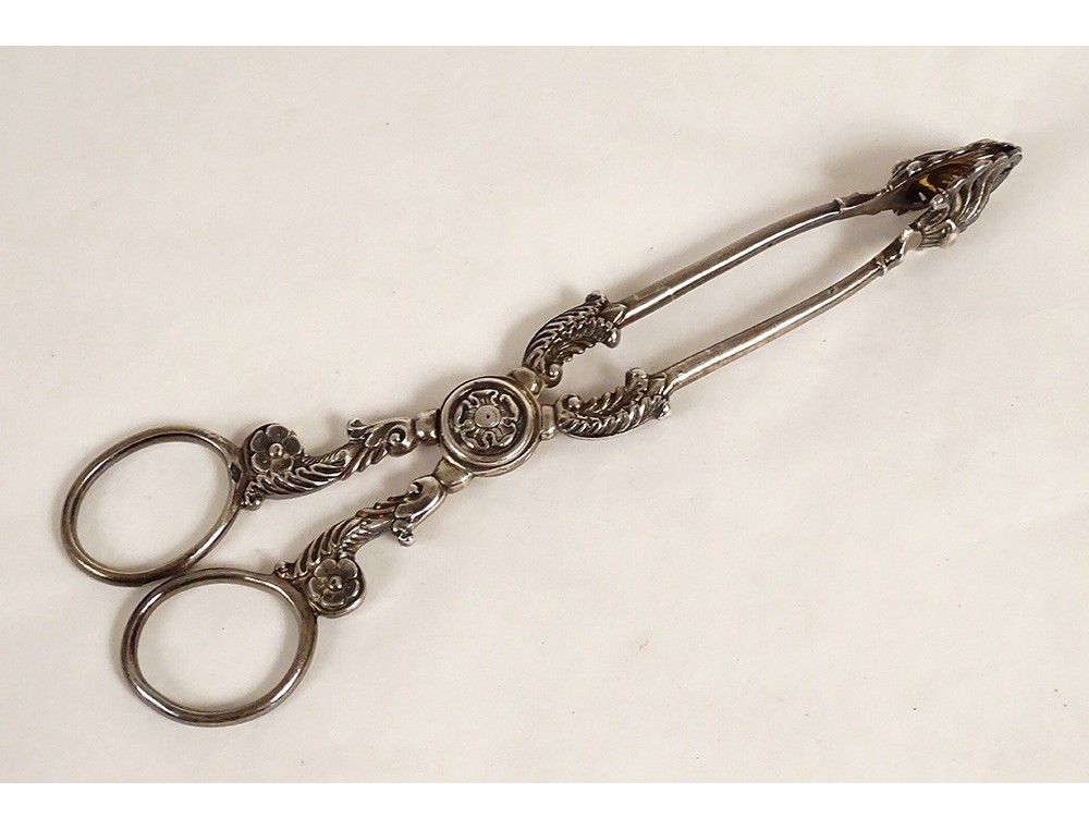 Finely chiseled solid silver sugar or petit fours/mignardises tongs, decorated with flowers, foliage and palmettes, Vieillard hallmark (1st title Paris 1819-1838) and guarantee hallmark, from the 19th century Restoration period.