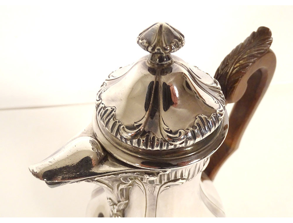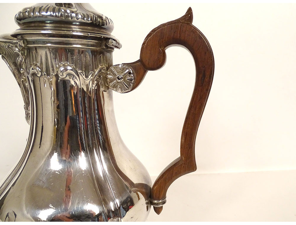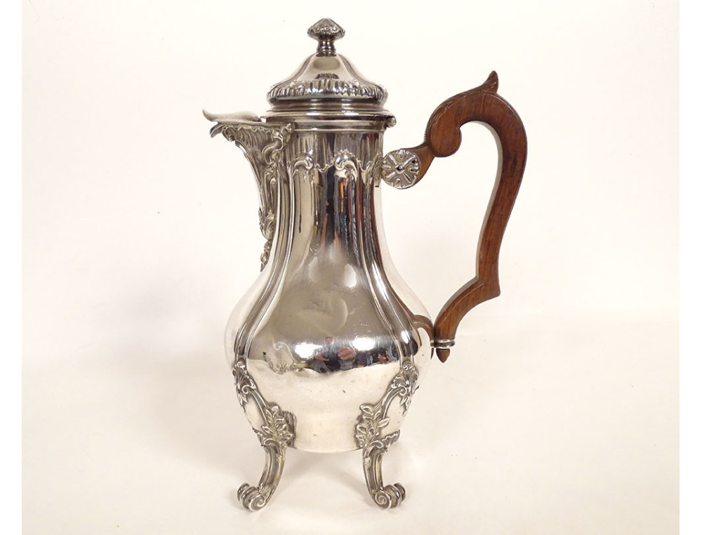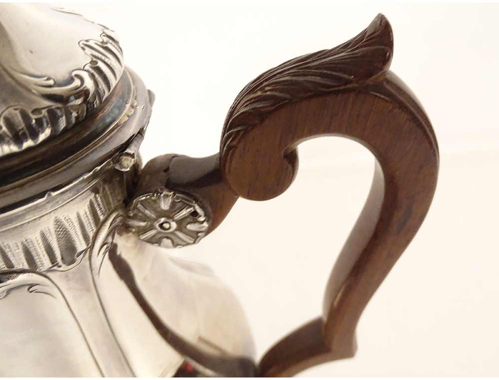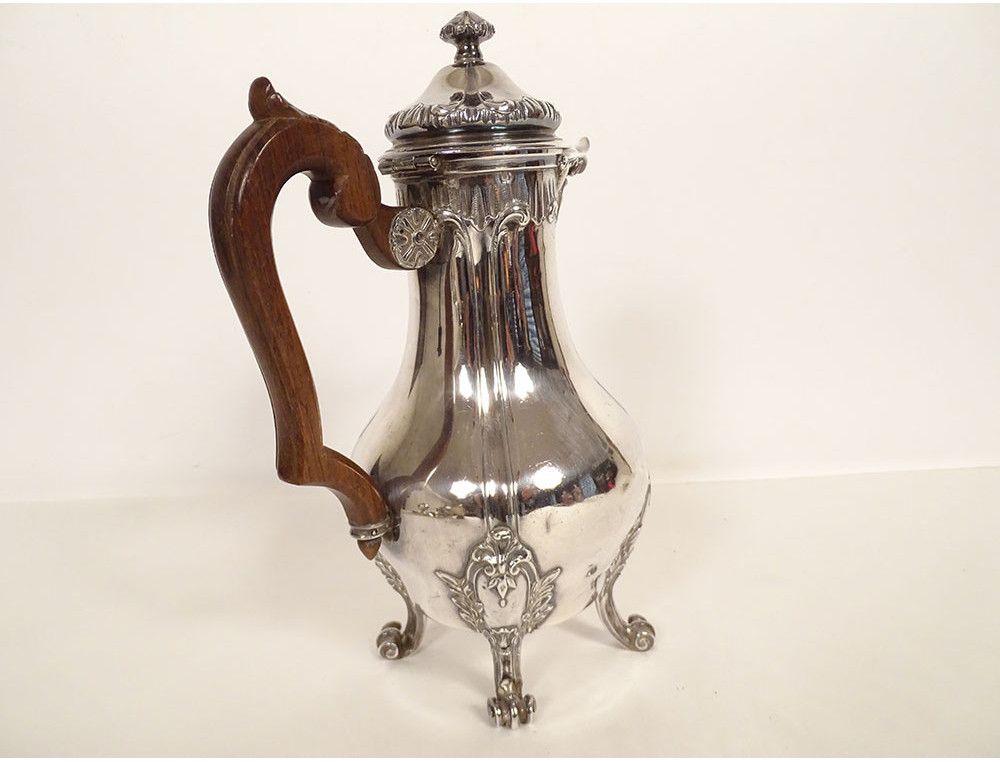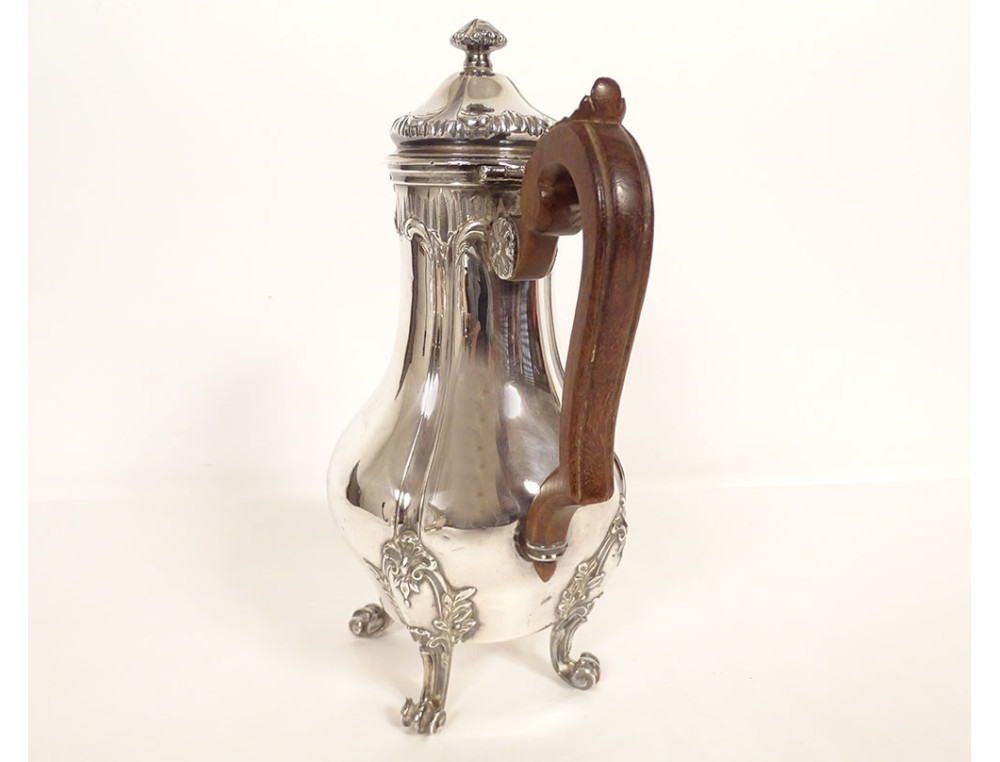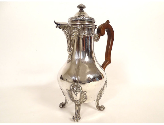 Louis XV style coffee pot - coffee pot in finely chiseled solid silver, with rocaille decoration of stylized foliage, tripod base with stylized shells applied, Minerva hallmark and L. Lapar* silversmith, wooden handle (rosewood), late 19th century.