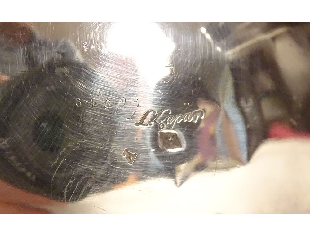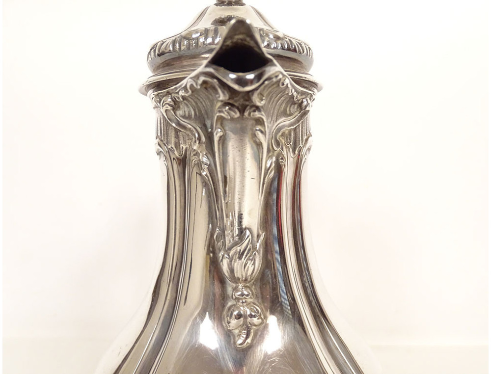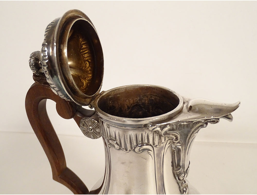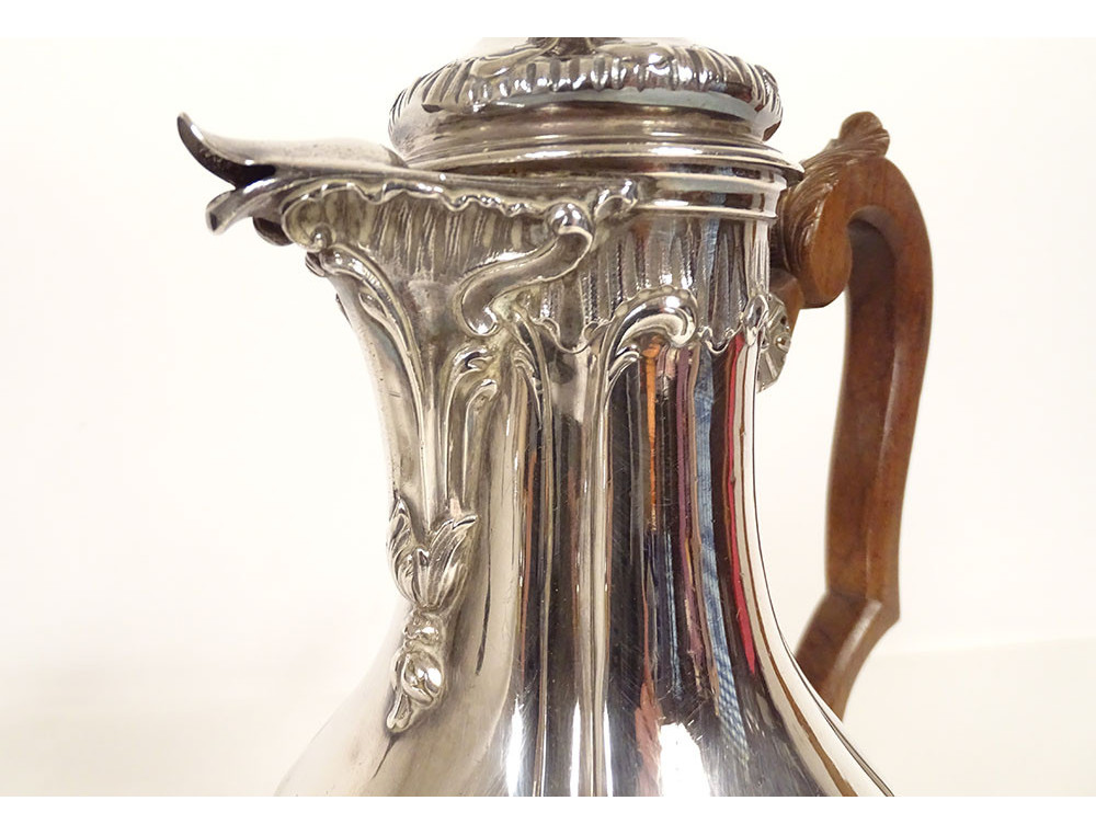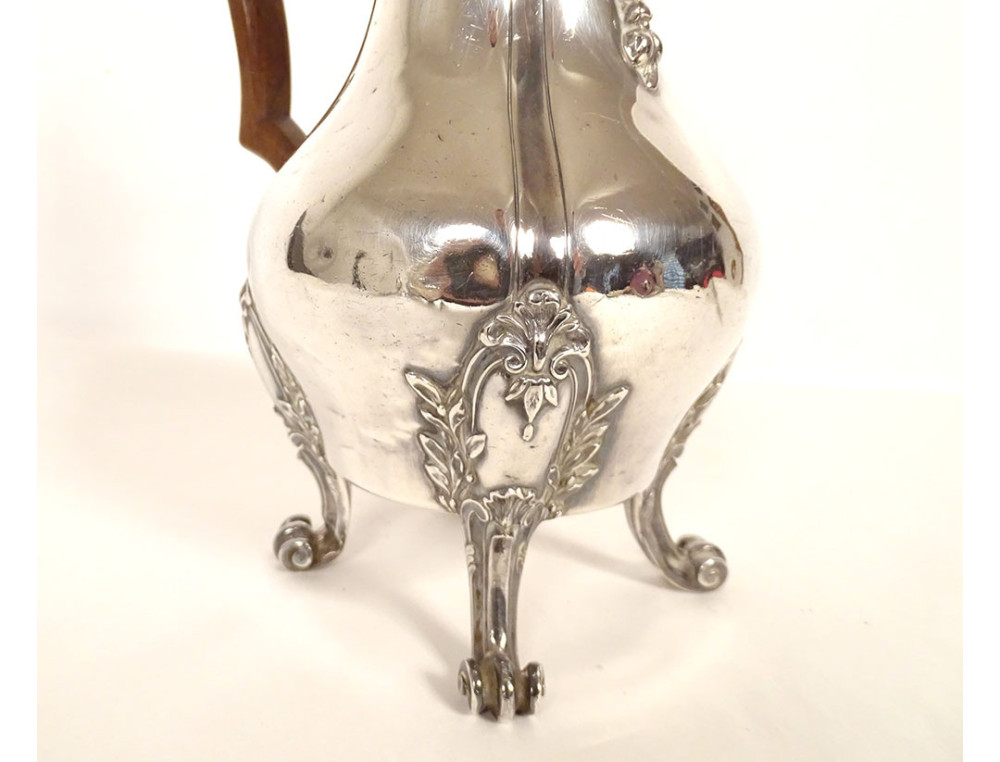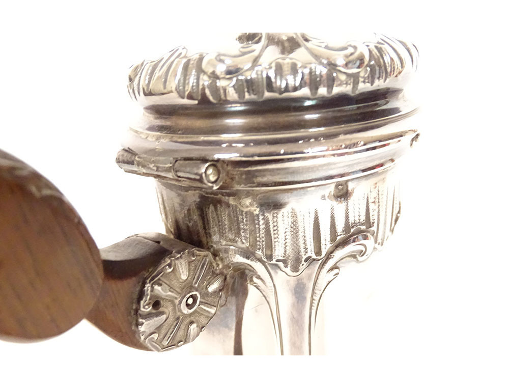 Louis XV style coffee pot - coffee pot in finely chiseled solid silver, with rocaille decoration of stylized foliage, tripod base with stylized shells applied, Minerva hallmark and L. Lapar* silversmith, wooden handle (rosewood), late 19th century.