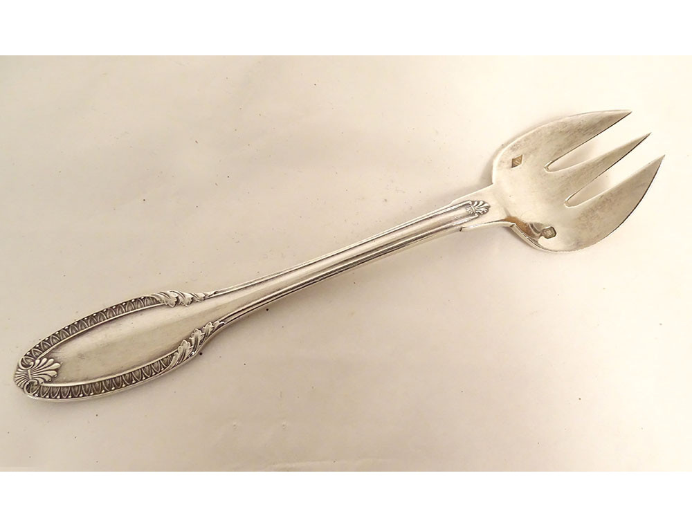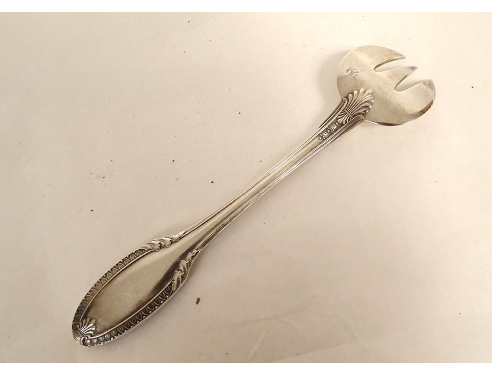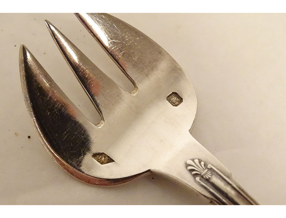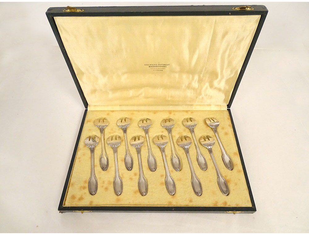 Set of 12 finely chiseled solid silver oyster forks decorated with palmettes and fine egg-and-dart friezes, hallmarked with Minerva (1st standard) and goldsmith's hallmark EP for Puiforcat (1857-1927), in their original box, dating from the late 19th-early 20th centuries.