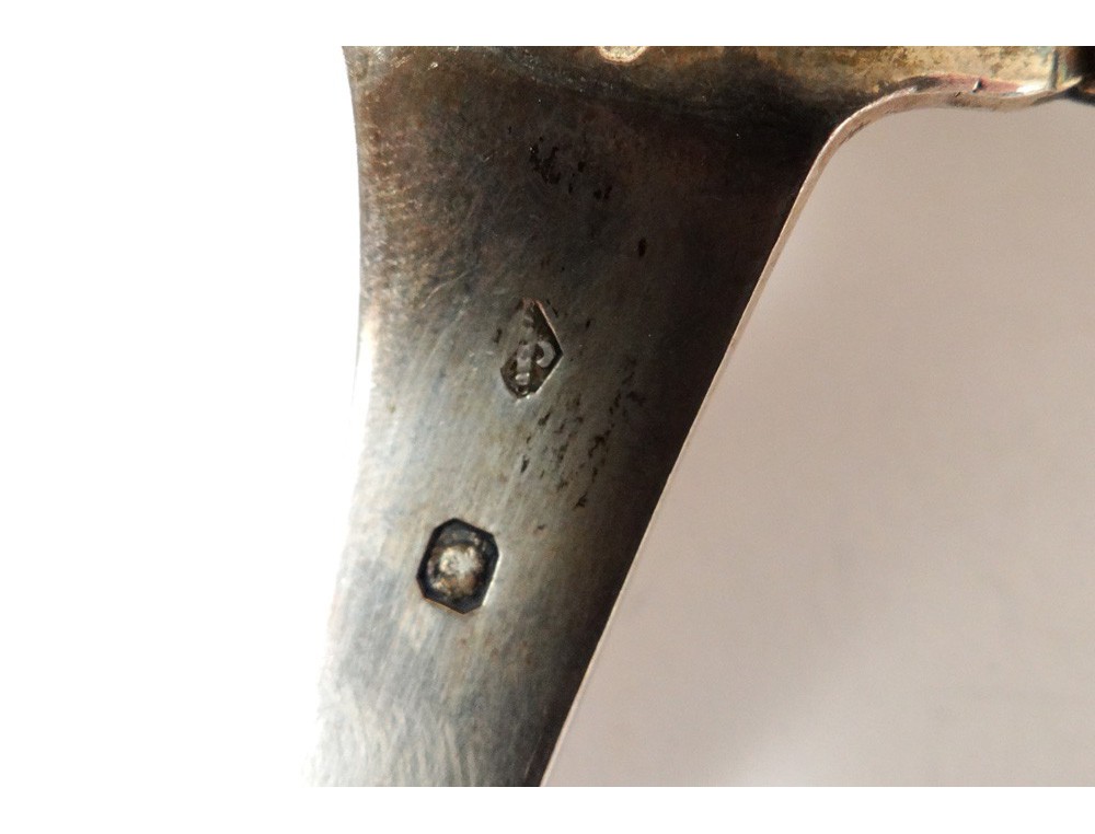 Very nice spoon sprinkle finely chopped in silver and lace, decorated with flowers, leaves and shells on the handle, punched Minerva (1st title) and punch goldsmith to Napoleon III nineteenth century.