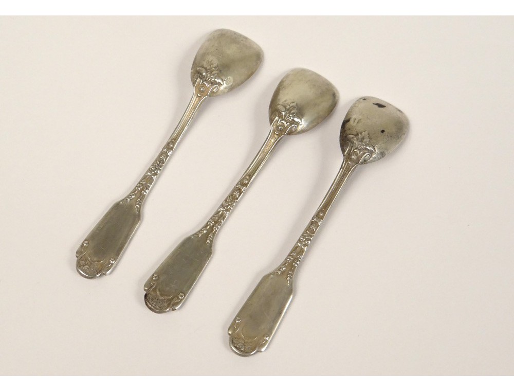 Very nice set of salt 3 tablespoons finely crafted sterling silver decorated with small flowers, punched Minerva (1 title) and punch goldsmith, Napoleon III nineteenth century.